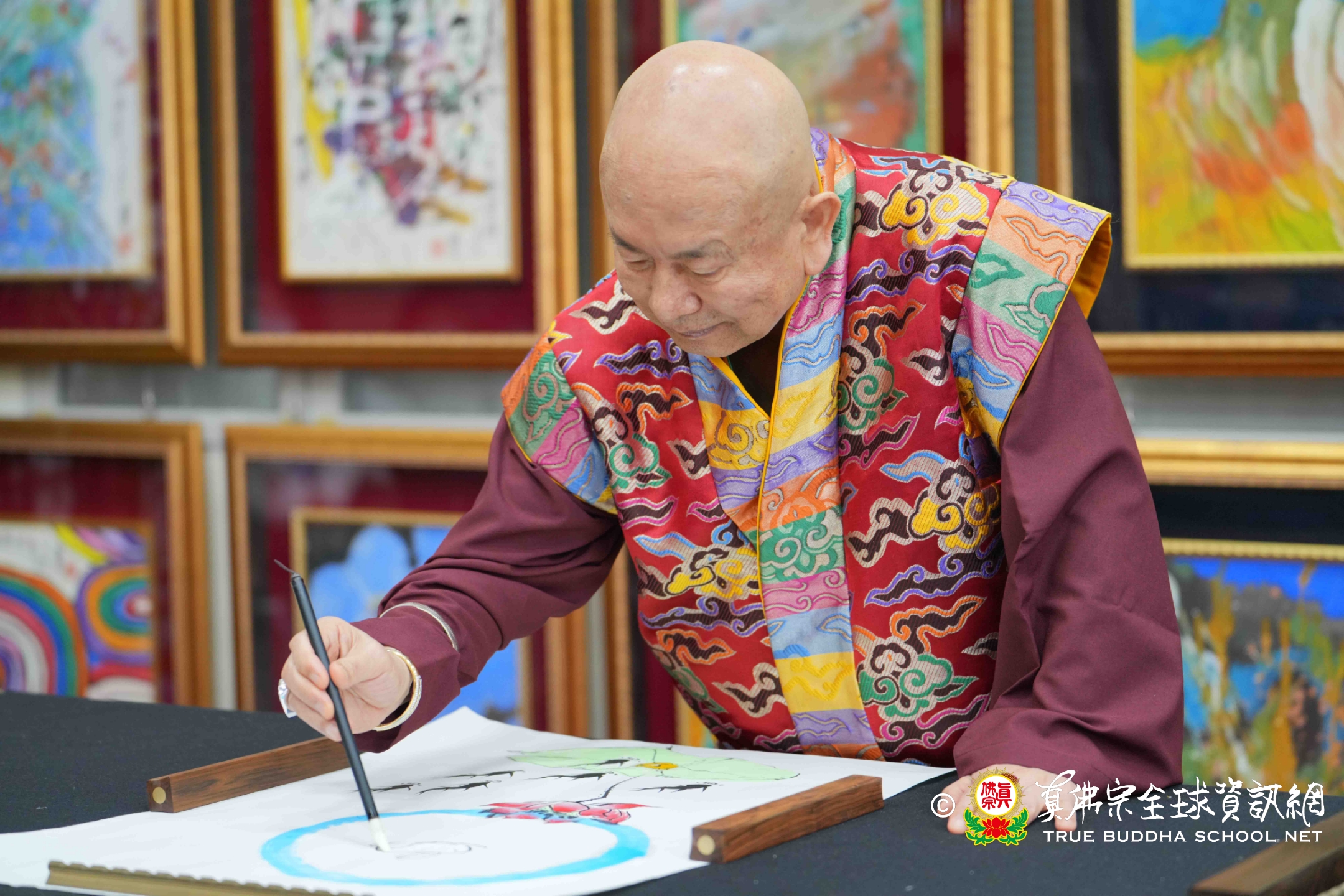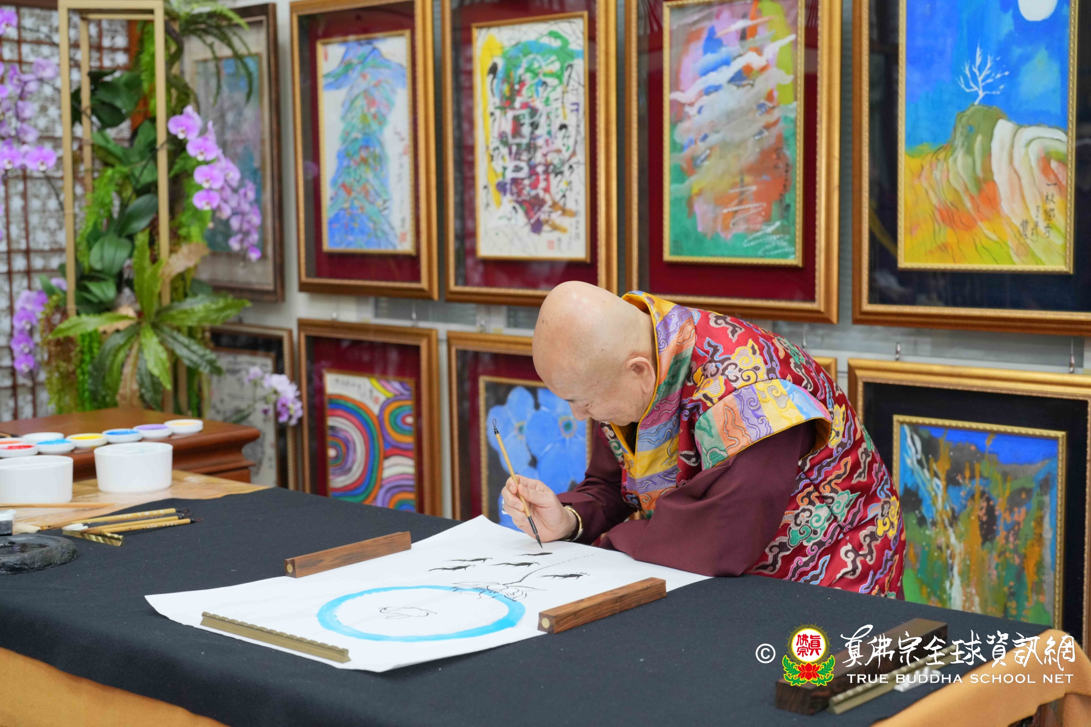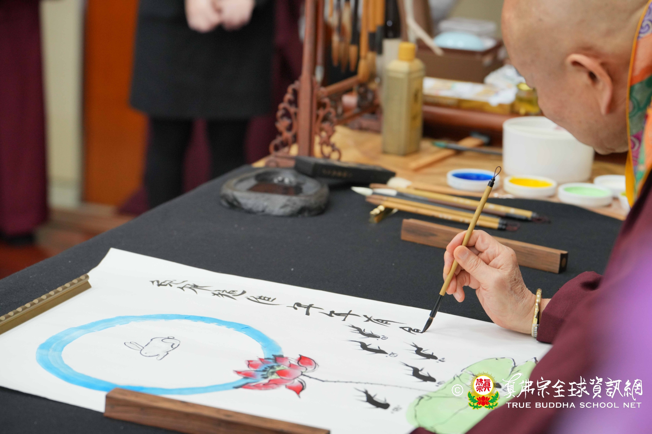 為了迎接新春,法王的畫作非常應景:畫中有兔子、蓮花、池塘和魚,寓意「兔」飛猛進、年年有「魚」。法王在採訪中表示「兔子是最平和的動物,希望在這一年,大家都能夠很平安的度過去。同時法王也揮毫寫下「鴻兔大展」,給予大家新春吉祥的祝福。