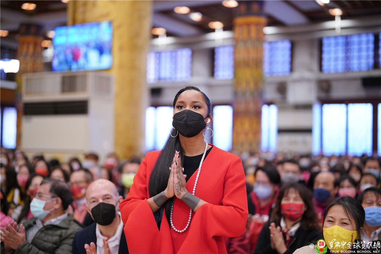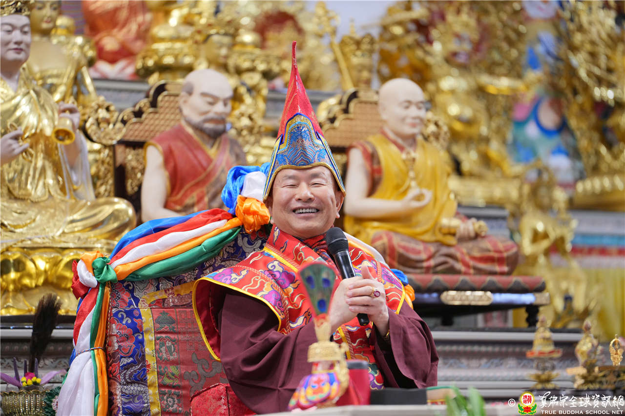 接著法王開示今天的勾財天女護摩法會,重點是三轉金剛勾之後再去勾,息災法可以把災難勾掉、增益法一勾就中獎、敬愛法勾心愛之人、勾老闆給你加薪升職、勾貴人,還可以把冤親債主勾到垃圾場焚化爐。勾財天女是阿彌陀佛心中所化,能把所有佛國最好的東西都勾到西方極樂世界裡來:七重羅網、七重寶樹、七寶池八功德水、大如車輪的蓮花等等,因此阿彌陀佛的西方極樂世界是十方諸佛所共同讚歎的淨土,所有的佛都伸出廣長舌相,讚歎極樂世界的莊嚴、殊勝、微妙和不可思議。法王說,真佛宗所有的同門將來都可以到西方極樂世界,不能去的用金剛勾勾去。