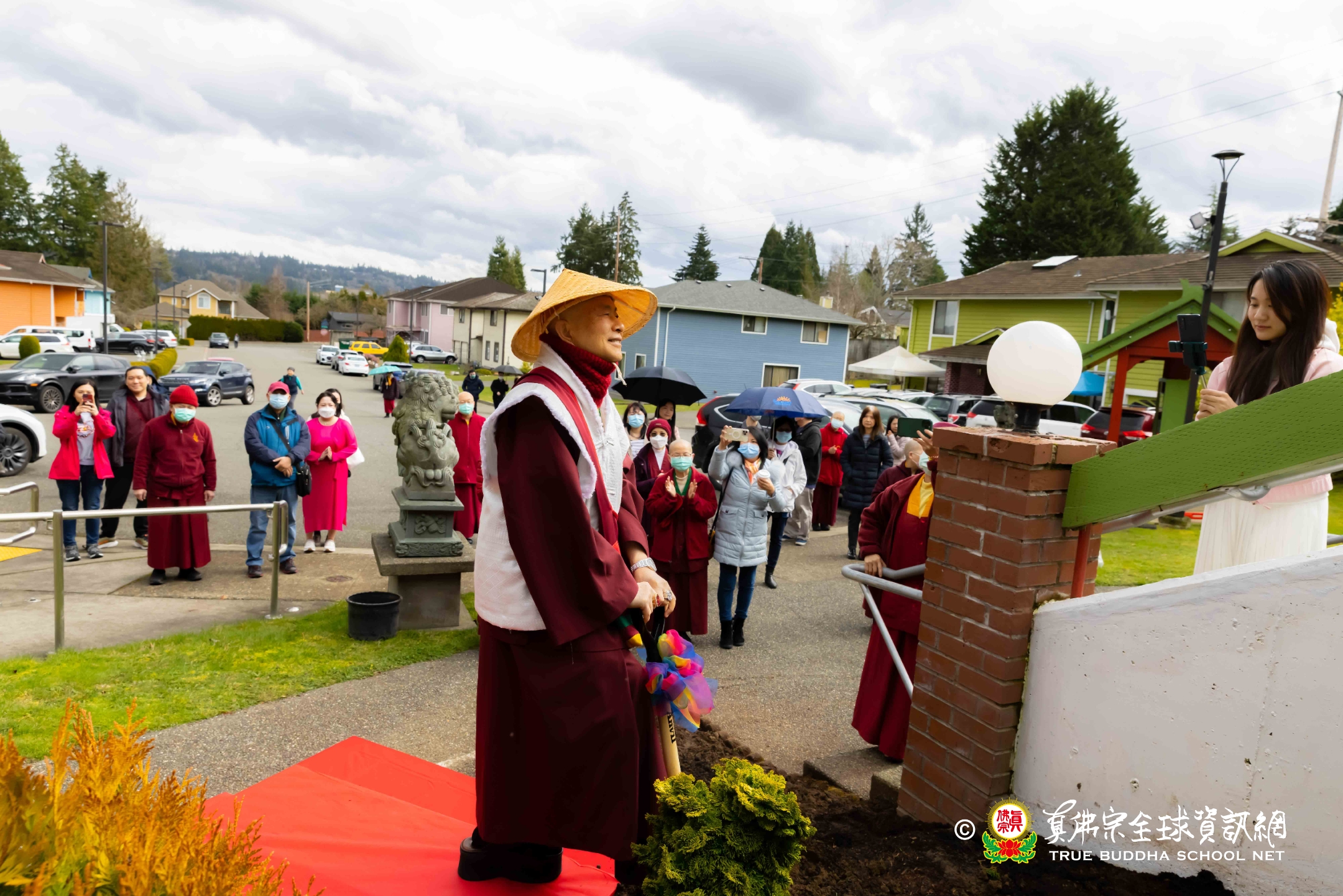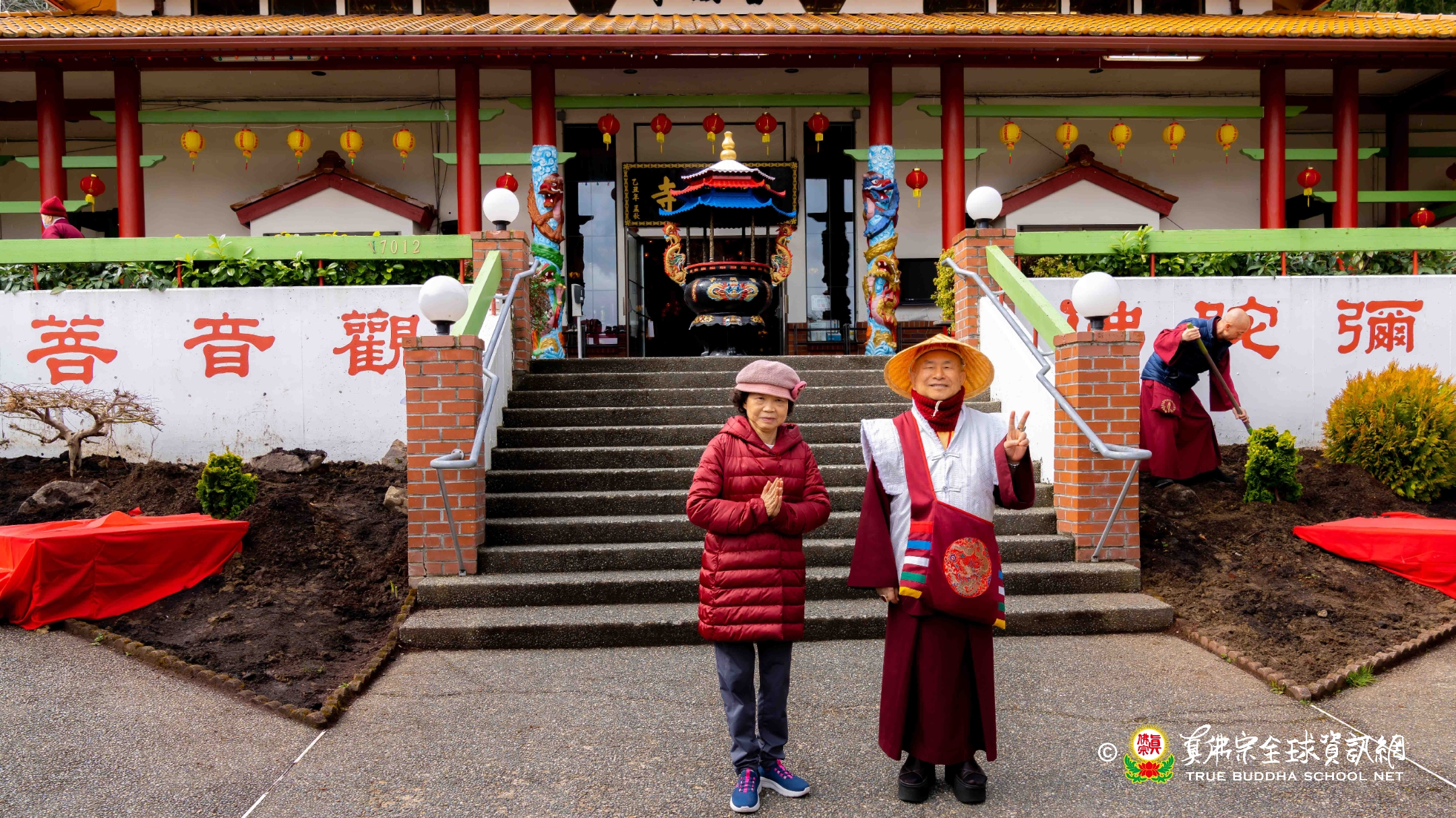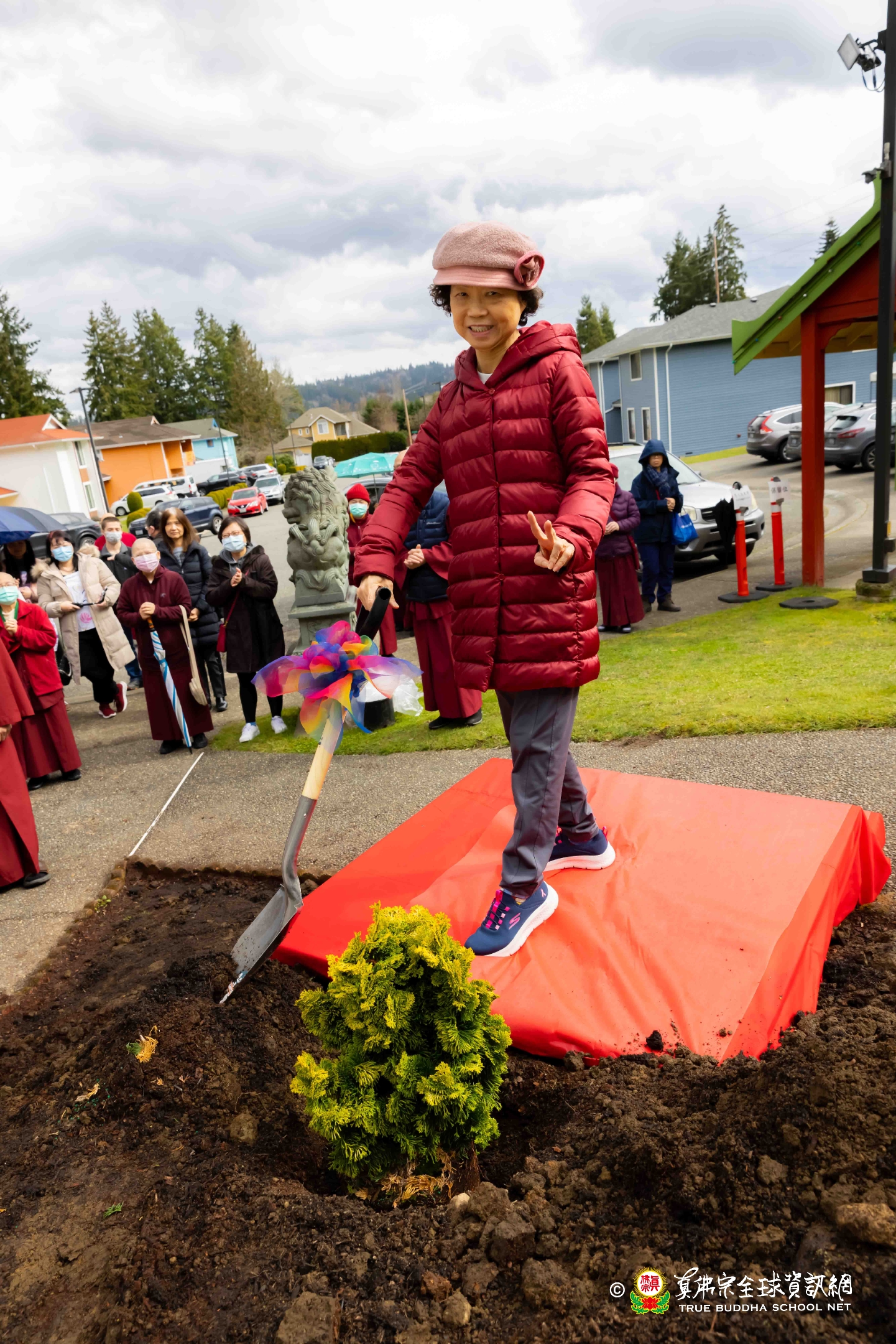 植樹節前夕2023年3月11日星期六午餐後,聖尊蓮生活佛與師母蓮香上師為祖廟西雅圖雷藏寺植新樹。