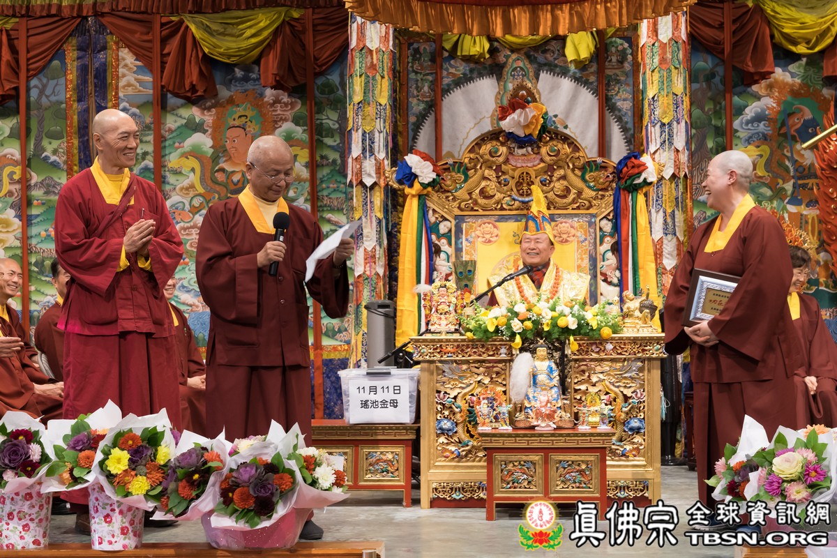 接著,四眾弟子虔誠恭請法王聖尊做寶貴的法語開示:『聖尊表示沒有瑤池金母,就沒有《真佛宗》、沒有蓮生上師、沒有這麼多的出家眾,也沒有500萬弟子。所以,金母是整個《真佛宗》的源頭,也可以說《真佛宗》是由金母創立的。由於金母是聖尊第一個相應的本尊,因此,聖尊每天早晚都跟金母問候、禮拜和祈禱。』
