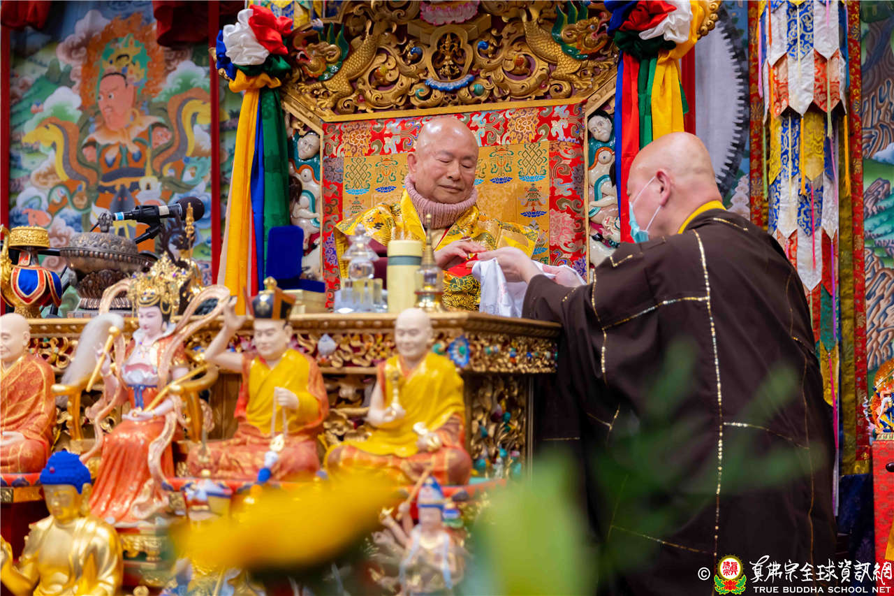 法王接着示範「千艘法船」的超渡,且表示從疫情開始至今,日日超渡,無一日間斷。首先法王祈請地藏王菩薩攝招有善根的幽冥衆,接着祈請護法諸尊,位列兩旁,再祈請三根本放光加持。接着請地藏王菩薩攝招幽冥衆引導在四週、請諸護法圍繞四週、金甲神在虛空中、瑤池金母放光加持、虎頭金剛放光加持、妙色身如來放光加持幽冥衆變化爲青春美貌。
