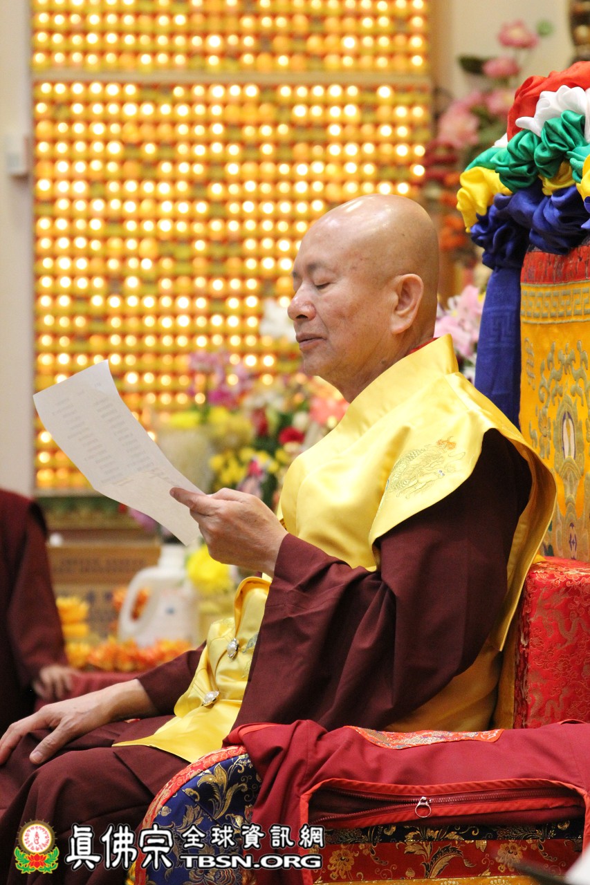 晚餐在雷藏寺大飯店裡的壽筵,除了美味豐盛的佳餚外,天音雅樂合唱團還特別獻唱好聽的歌曲供佛,還有同門表演古箏,現場氣氛好不熱鬧,慶賀佛誕的熱情洋溢。用完餐後,供餐的功德主也準備了讓人垂涎欲滴的蛋糕,大家歡唱生日快樂歌為聖尊慶生。步出雷藏寺大飯店,聖尊仍舊慈悲的一一為大家摩頂加持。隨後,大家跟著聖尊到大殿禮佛時,全體弘法人員及所有同門,與師尊、師母一起在進入大雄寶殿前的階梯,來一張集體大合照,師尊、師母身旁圍繞著所有的弟子,真佛大家庭的溫馨寫照,每個人臉上都有著春風拂面般的笑容。