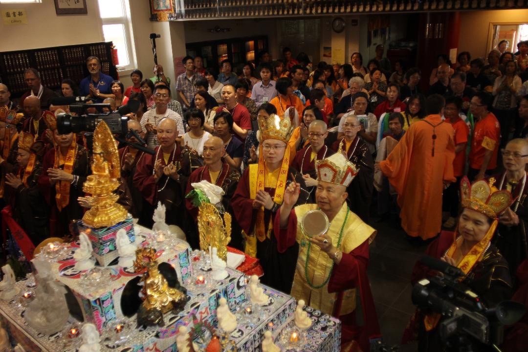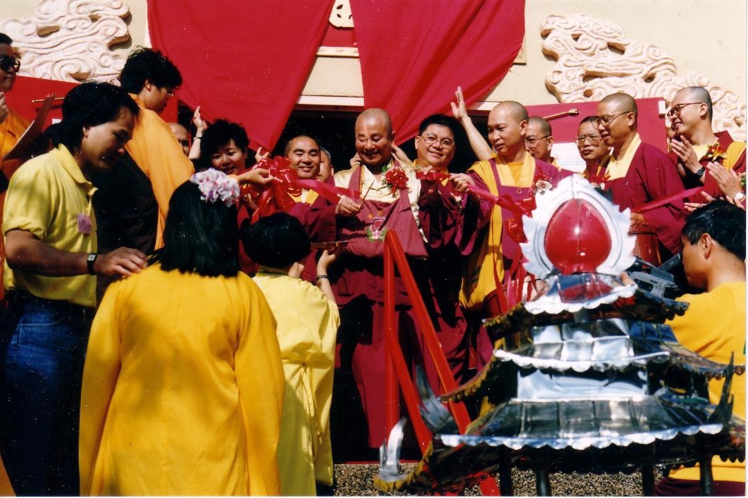 1994年8月6日,聖尊應邀為剛落成具密宗色彩的「白雲雷藏寺」開光及剪彩,同行有八位上師、兩位法師。開光當天,天降微微甘露,將8月浩熱的卡城,變得一片清凉,暑氣全消。當9時正,聖尊車隊蒞臨白雲雷藏寺時,大日從雲層中沖破,頓時陽光普照,光芒萬象一片吉祥。寺外人山人海,喜氣洋洋,隨着聖尊金剪一揮,紅布卸下,露出了金光閃閃的「白雲雷藏寺」横匾,同時也象徵白雲雷藏寺弘法度眾的新開始。當天聖尊賜下墨寶「深入禪定是法王 白雲深處樂仙家」,並賜受出家戒和菩薩戒。