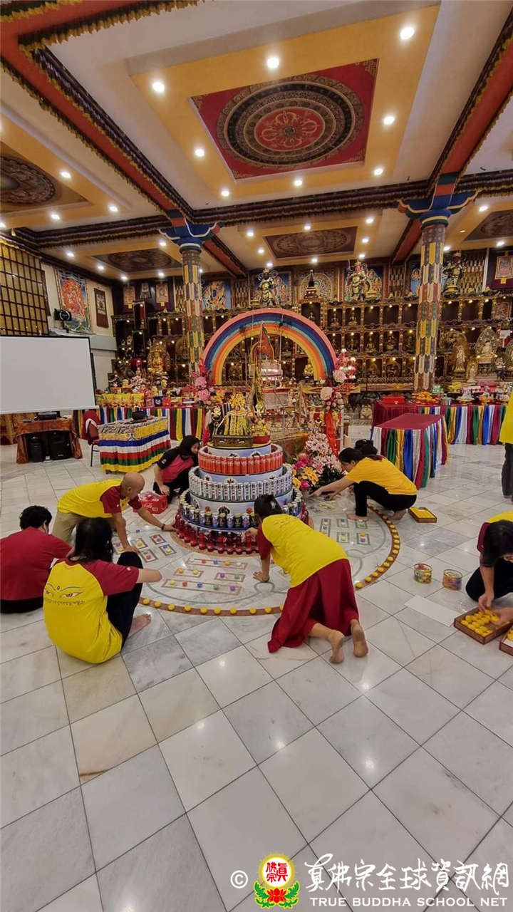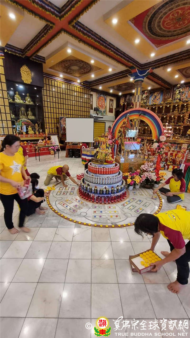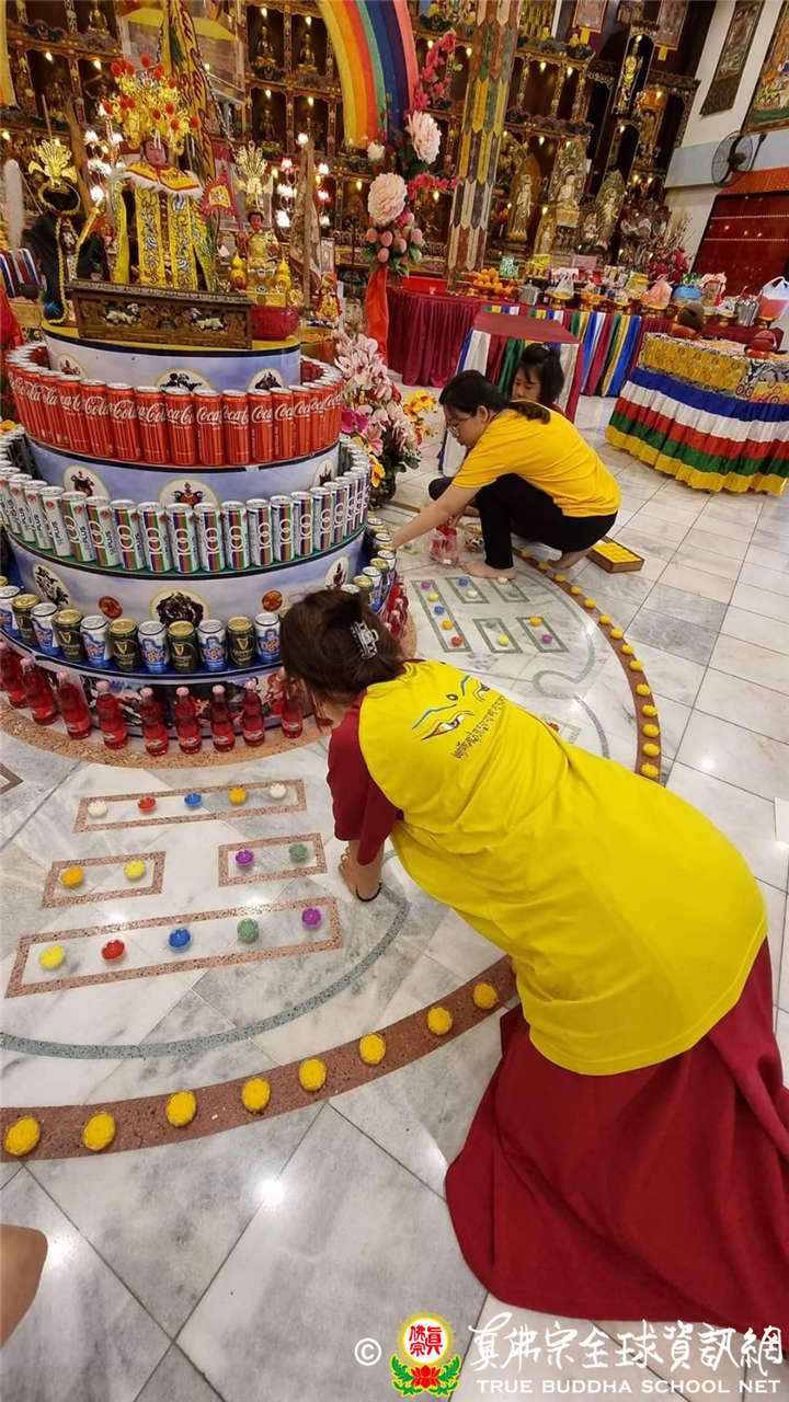 2023佛誕請佛住世薈供/水供法會 花絮報導 世界各地道場響應宗委會號召2023年6月24日全球雲端連線請佛住世薈供/水供法會,進入密集準備階段。 在馬來西亞真佛宗怡保雷藏寺,同門互相合作帮助为準備6月24日全球真佛宗水供大法會佈置金母水供莊嚴壇城。