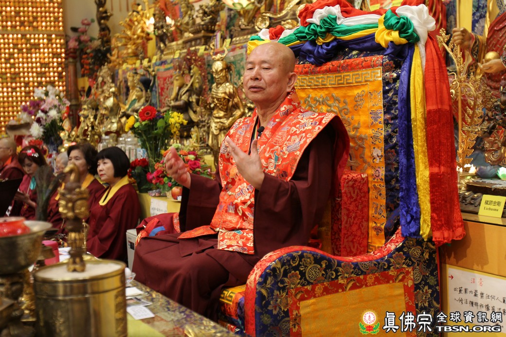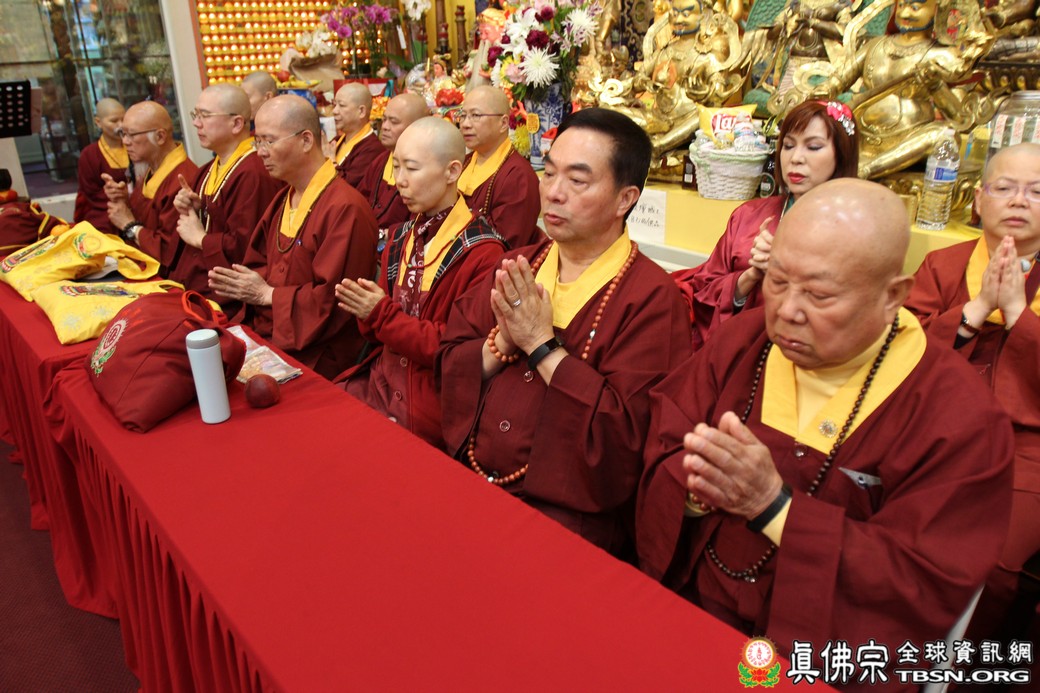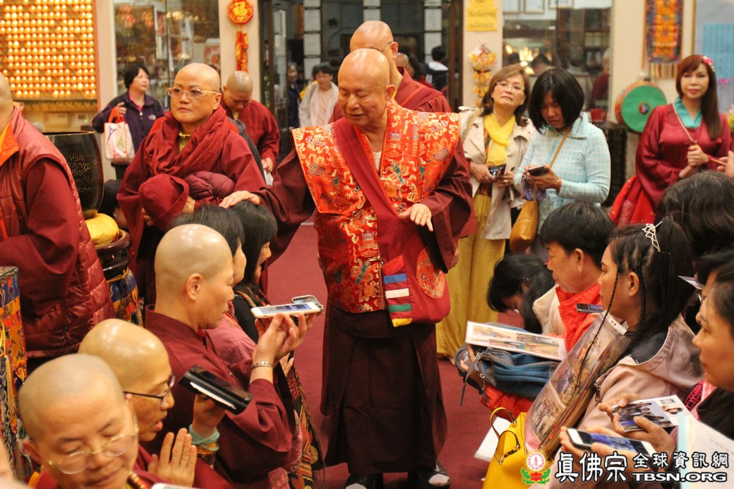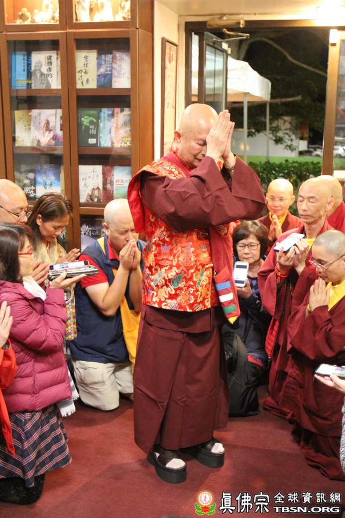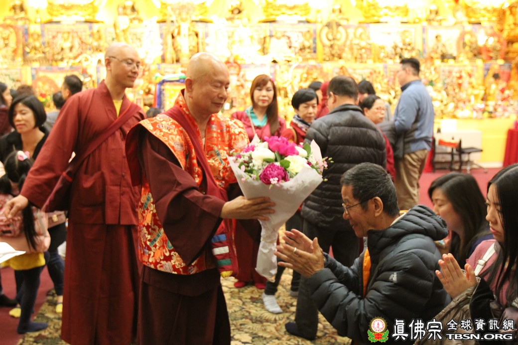 精闢的道果開示結束後,雷藏寺唱誦組帶領大眾唱誦阿彌陀佛聖號。聖尊為新皈依弟子做皈依灌頂,並加持大悲咒水、佛像開光。臨行前,聖尊慈悲為與會大眾摩頂加持。迎師隊伍莊嚴整齊的恭送聖尊回到密苑,全體向根本上師虔誠頂禮,感恩根本上師的珍貴法語開示。
