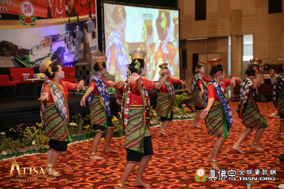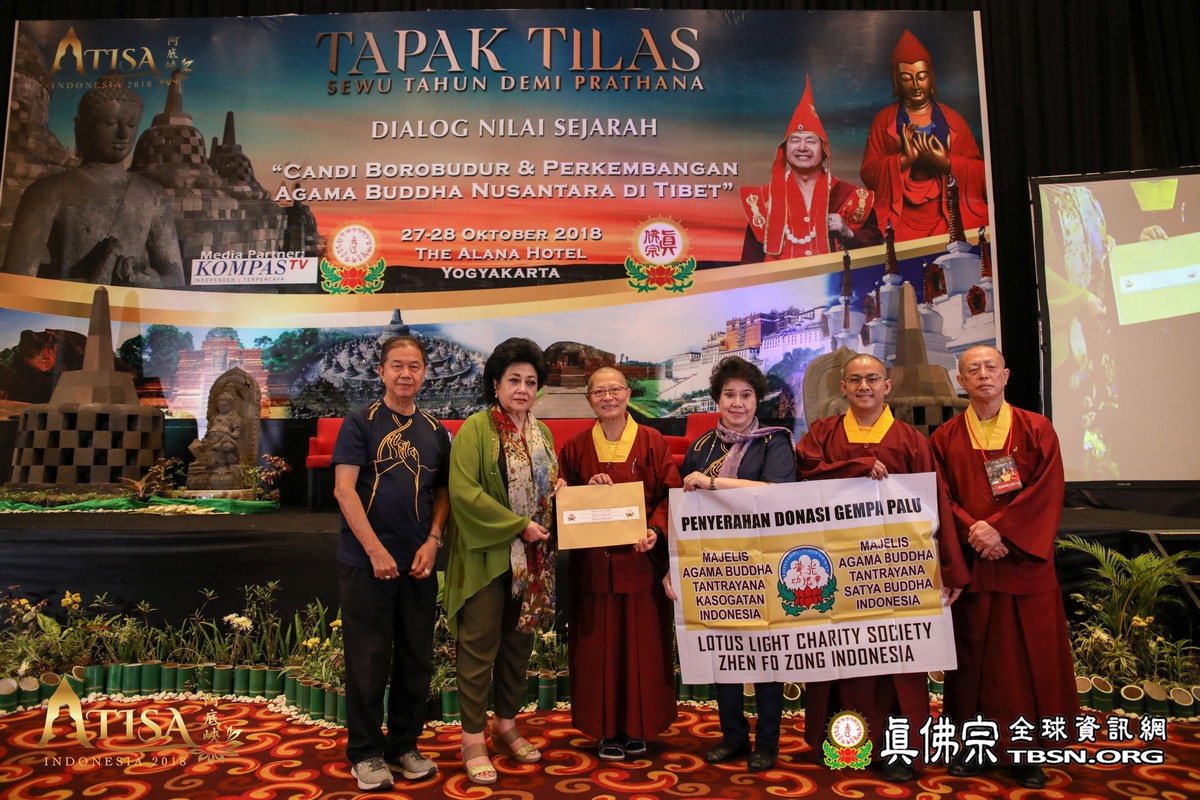 在所有致詞結束後,世界宗務委員會及印尼真佛宗密教總會、印尼真佛宗密教總協會,共同致贈5億元印尼盾給印尼佛教總會(WALUBI),用以協助印尼蘇拉威西海嘯重災區巴路(Palo)的賑災與重建,由總會長鄒麗英女士代表接受贈與。同時,主辦單位也將多幅蓮生活佛所創作之墨寶畫作,致贈予蒞臨活動的嘉賓們。場面歡愉溫馨,與會大眾無不希望下次的講座活動能早日舉行,讓大眾能再以多種不同角度來接近佛法、深入智慧,也期待聖尊蓮生活佛於12月佛駕印尼,主持12月8日於印尼雅加達地區舉行的阿底峽尊者大法會,並蒞臨印尼各地多處道場,以佛光加持這個千島之國。