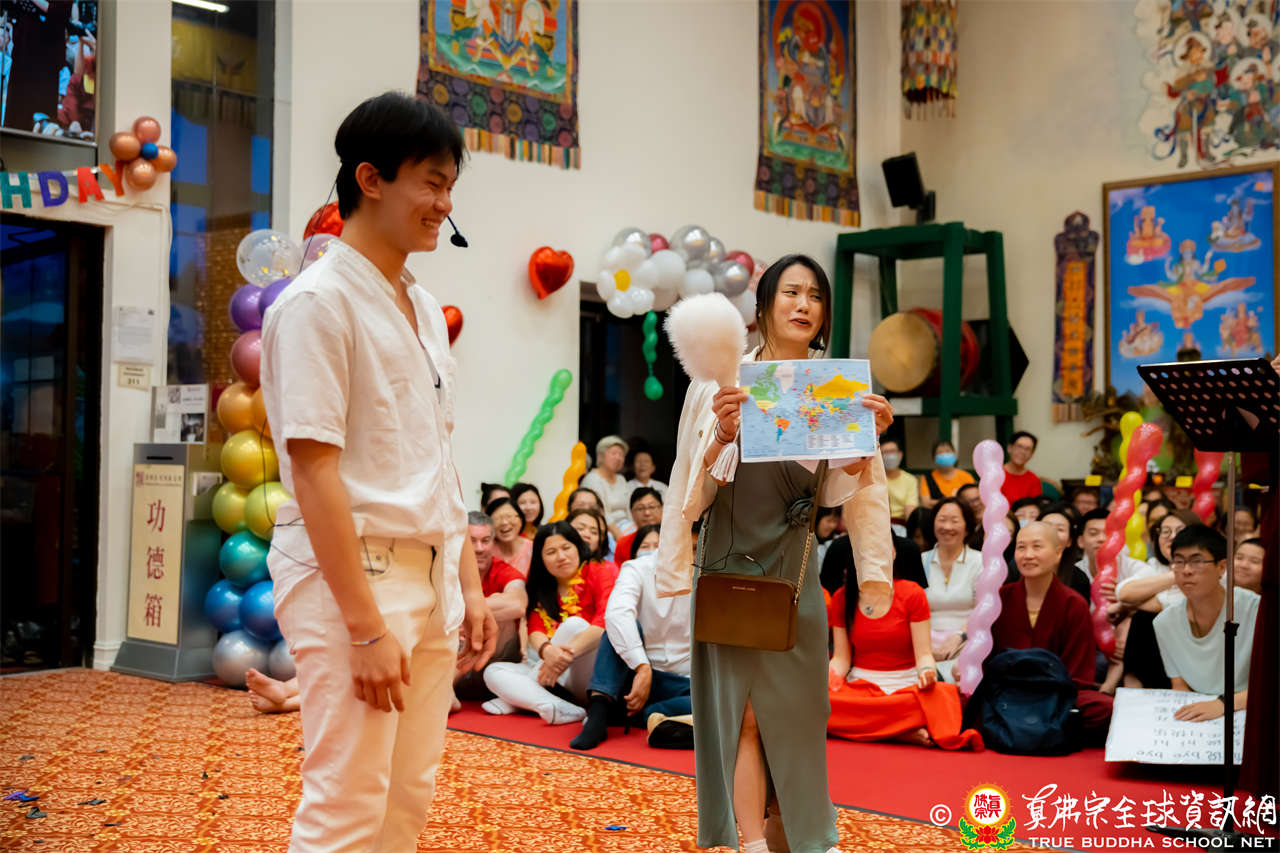 最後邀請師佛偕同師母與四眾弟子在壇城前大合影,壽誕慶祝晚會在弟子們的歡樂笑聲中,圓滿落幕。整場晚會,在主持人蓮訶上師和周慧芳律師二人聯手之下,猶如雙簧表演,二人妙語如珠,節目緊湊沒有冷場,以及別出心裁創意表演,師佛、師母整晚都樂開懷。師佛特別稱讚整場節目都很棒,最後在歡樂的『生日祝福歌』歌聲中,眾人才依依不捨的向師佛、師母道晚安。大家意猶未盡,彼此都情不自禁地相約明年師尊佛誕時,將再臨祖廟向師佛賀壽。