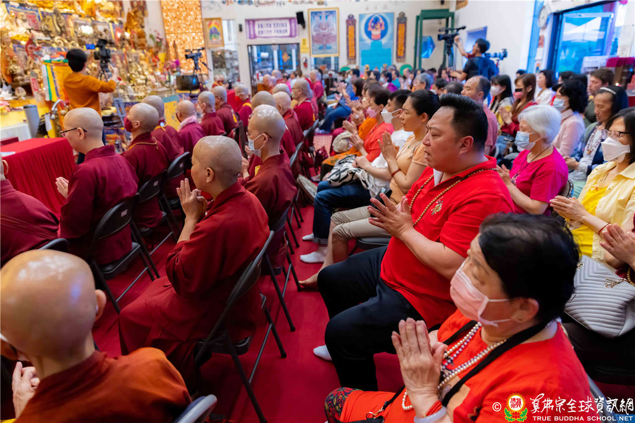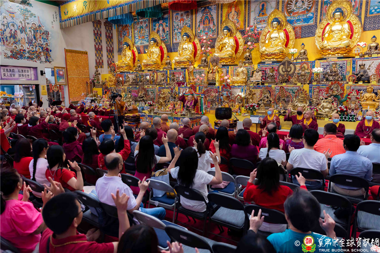 2023年7月22日晚上八時西雅圖雷藏寺大雄寶殿裡人潮匯聚, 來自世界各地及美國各州的四眾弟子,虔誠恭敬的跟隨著聖尊蓮生活佛盧勝彥修持阿彌陀佛本尊法。