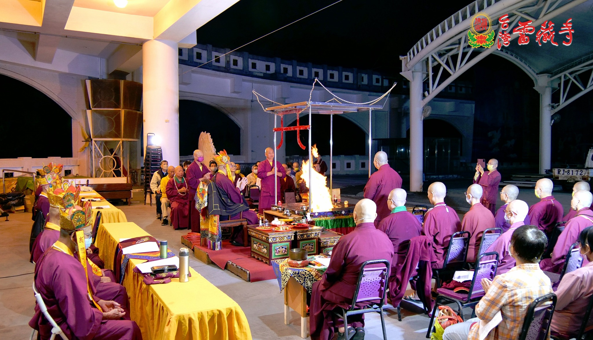 在司儀蓮瓦法師的帶領下,護摩如儀於7點進行,蓮霆法師、蓮巖法師兩位事業金剛護爐,主壇長老釋蓮栽上師演化手印,在熊熊烈火中供品依序下爐,於慈悲莊嚴的「嗡。金母悉地吽。」咒音中,與會大眾融入專一,觀想與主尊合一。在寧靜夜晚之中,咒音迴盪於廣場迴廊,猶如置身於瑤池仙境。