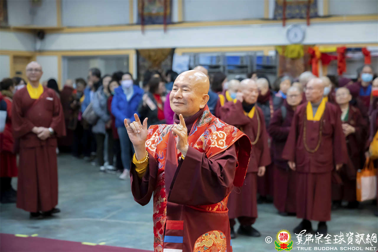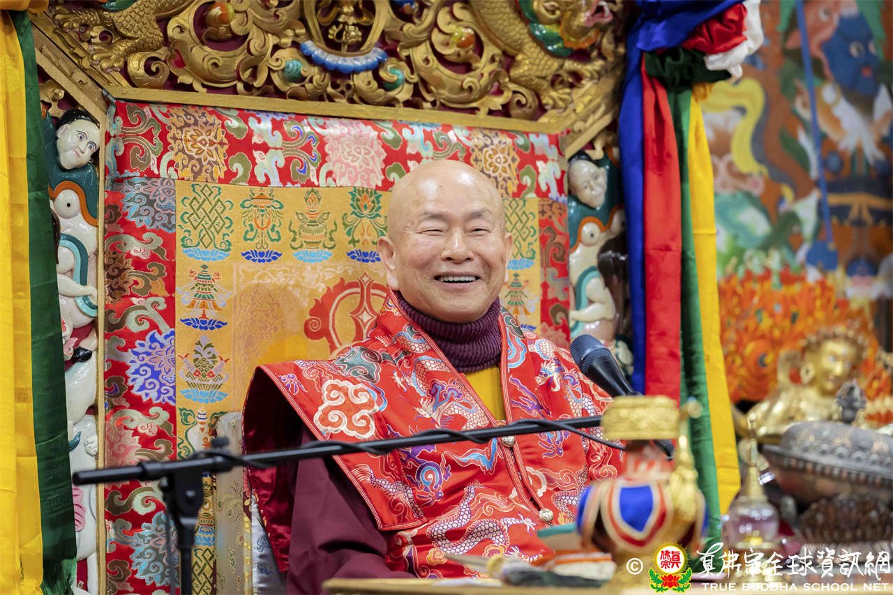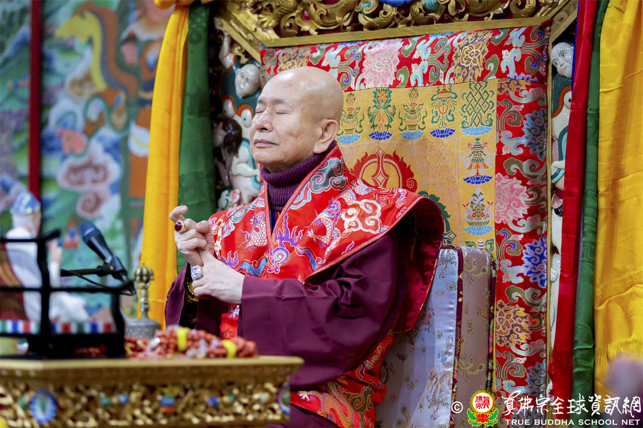法王開示至此,護摩法會圓滿結束。接著,法王與線上的弟子打招呼,並爲現場出席者賜授阿彌陀佛法灌頂。