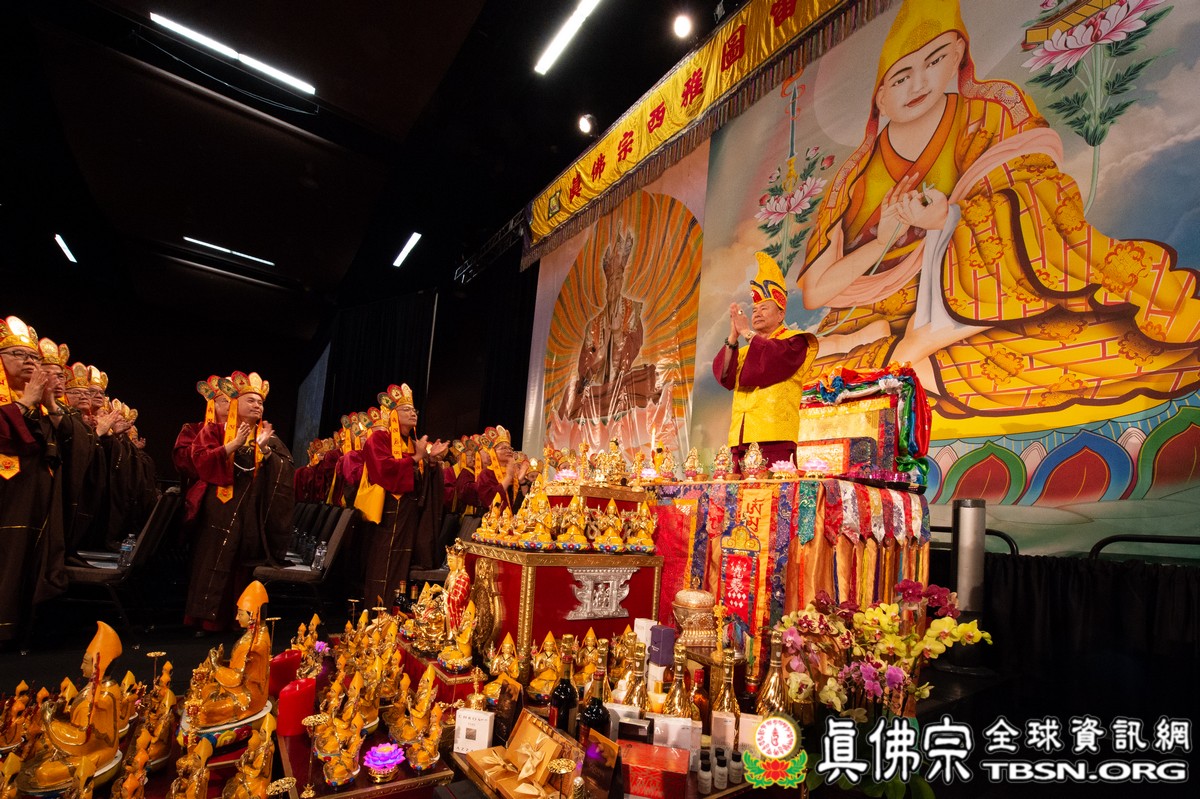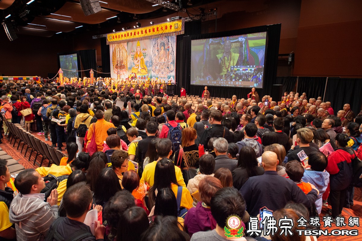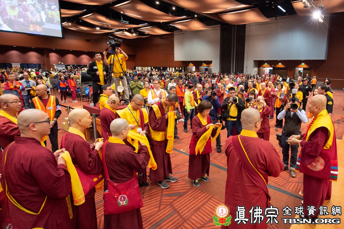 法會當日早上十點半,所有主祈者排著長長的人龍環繞會場,等候敬獻哈達,顯示出真佛弟子敬師重法的誠心。之後,聖尊立即開始為大眾簽書,此時會場播放著宗喀巴祖師與阿彌陀佛的莊嚴咒音。