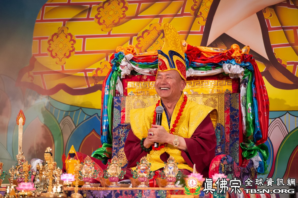 肅穆的法會儀軌圓滿結束後,是大眾殷切期盼的聖尊傳法開示。聖尊一開始提到在法會當中看到阿底峽尊者及宗喀巴尊者降臨法會。在多年前,黃教第一百世的甘丹赤巴法王來到西雅圖,賜給了師尊法王龍袍、灌頂瓶、金剛鈴杵、唸珠、手鼓,甘丹赤巴就是代表了宗喀巴祖師。