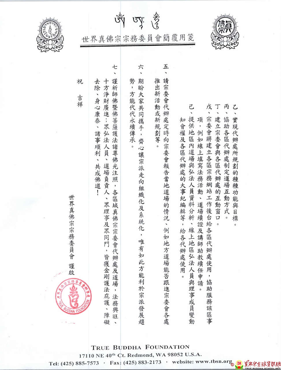 真佛道場遍佈全球各地,目前有三個國家地區成立密教總會/總協會,分別為台灣、馬來西亞、印尼,透過密總/密協促使該國家的道場凝聚力量,密總/密協亦猶如宗委會延伸的手,對於各項政策宣導給予道場輔導及照顧。而鑒於其他國家地區幅員遼闊,為了能夠更全面服務及照顧道場及弘法人員,故宗委會第六屆核心小組經過幾番會議討論,分別成立宗委會代辦處,