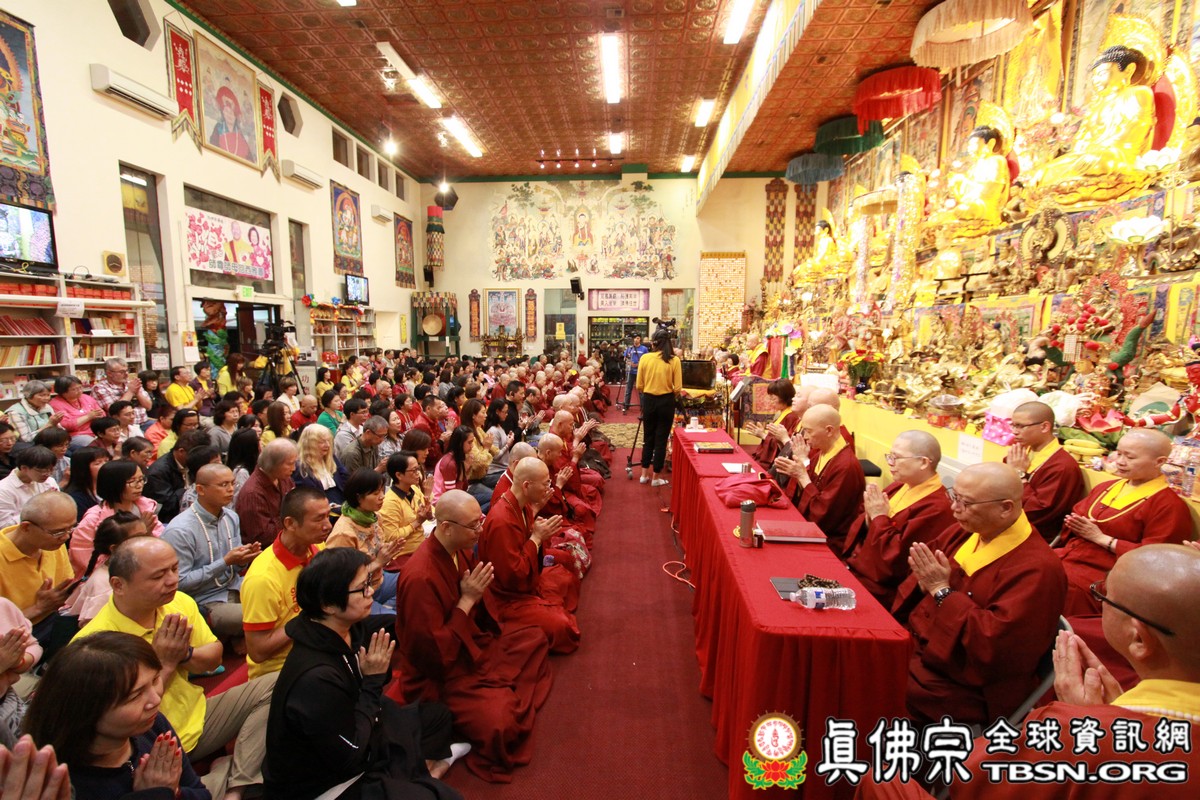 今晚的同修本尊是「黃財神」,同修會修法結束後,西雅圖雷藏寺舉行了隆重莊嚴的宗喀巴祖師唸誦法請法儀式,全體弟子虔誠祈請師尊蓮生活佛轉大法輪,首傳「宗喀巴祖師念誦法」。