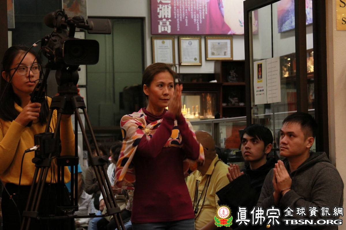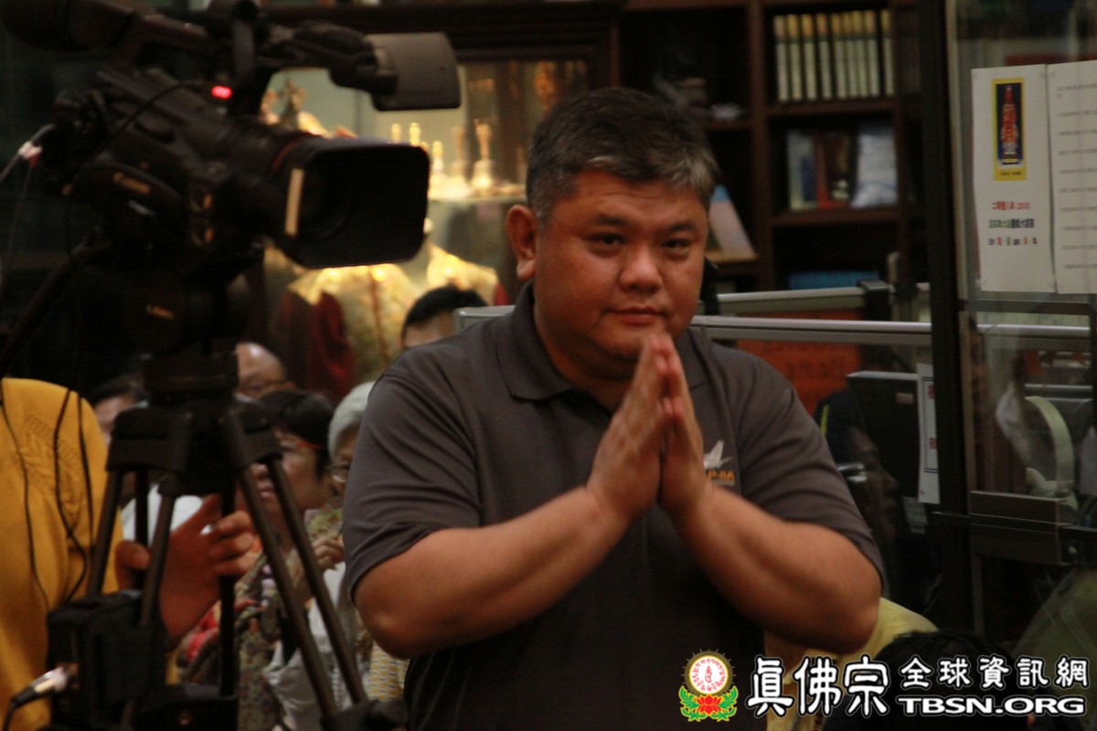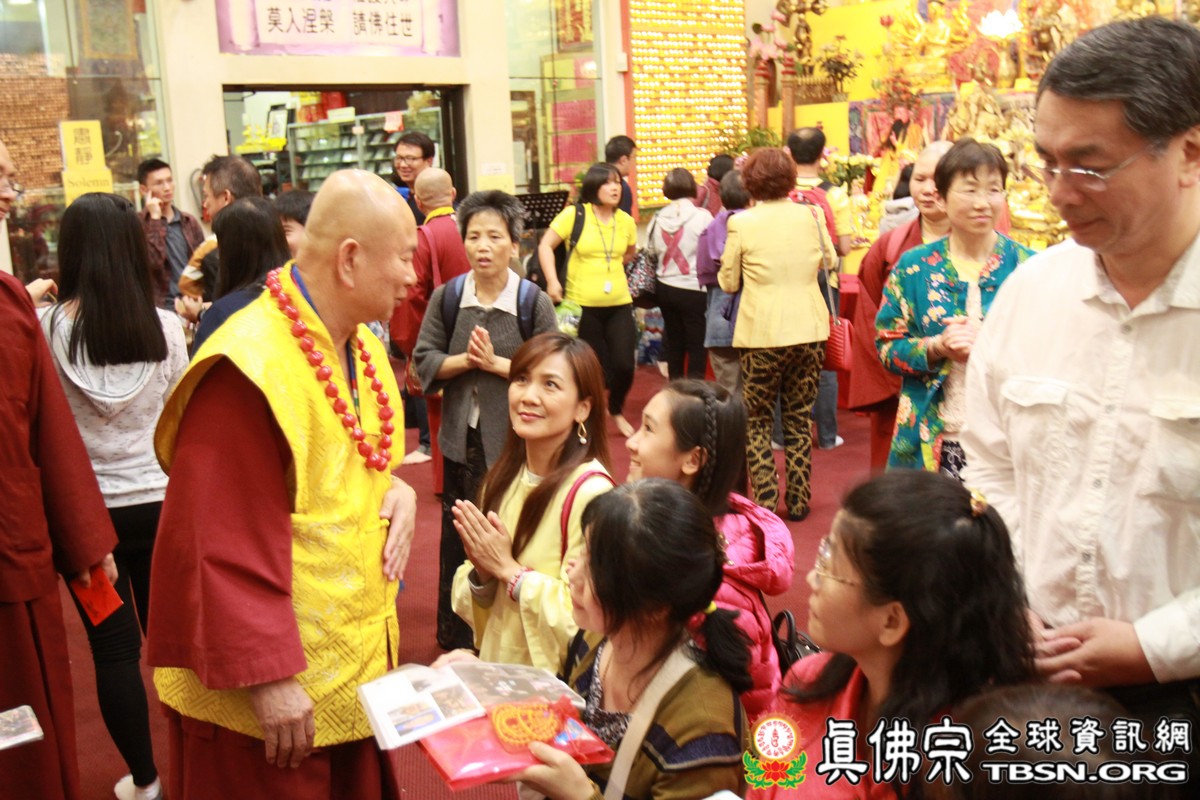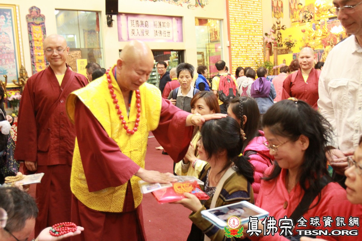 精彩圓滿的開示結束後,聖尊與大眾一起唱誦佛號,並為求皈依的信眾賜受灌頂、加持大悲咒水,以及開光佛像,臨行前還為大眾摩頂加持。求摩頂加持的信眾,人潮排到寺外的圓環,可以完全感受到真佛弟子們踴躍護持根本上師及虔誠重法的心。感恩根本上師再次傳授無上殊勝大法,利益無數眾生。