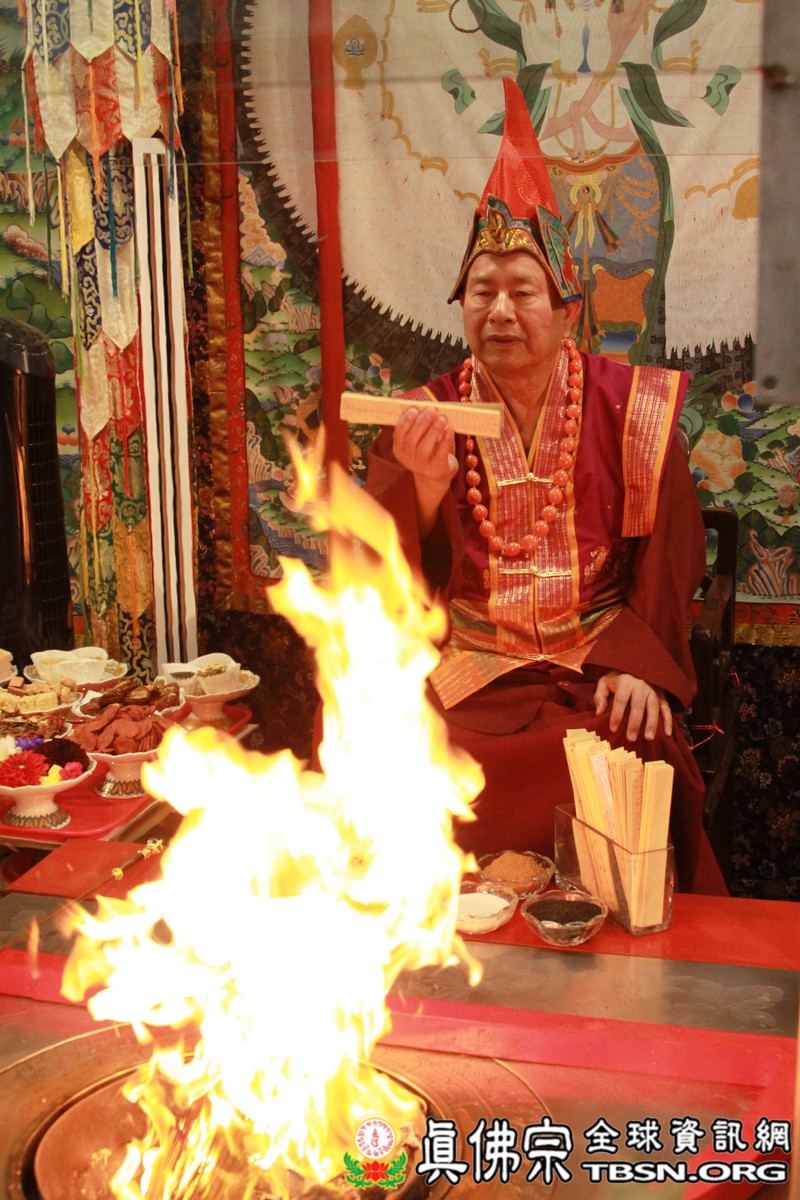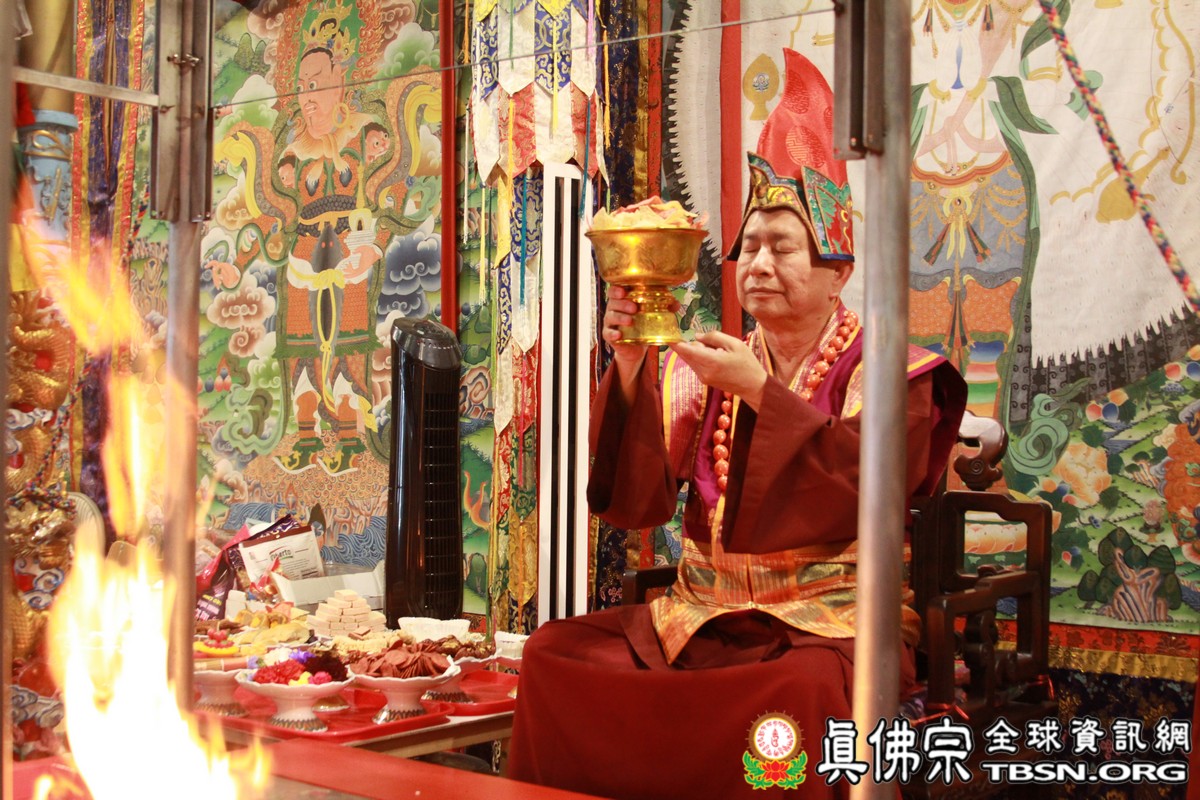 接著下午三時,真佛宗根本傳承上師無上法王蓮生活佛,主持「蓮華生大士護摩大法會」,並講授《道果》。