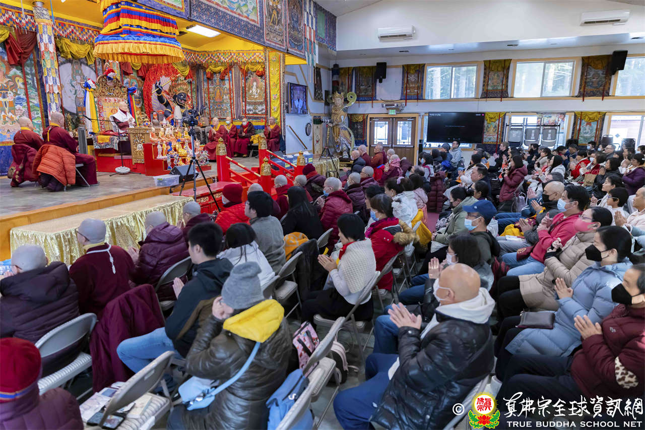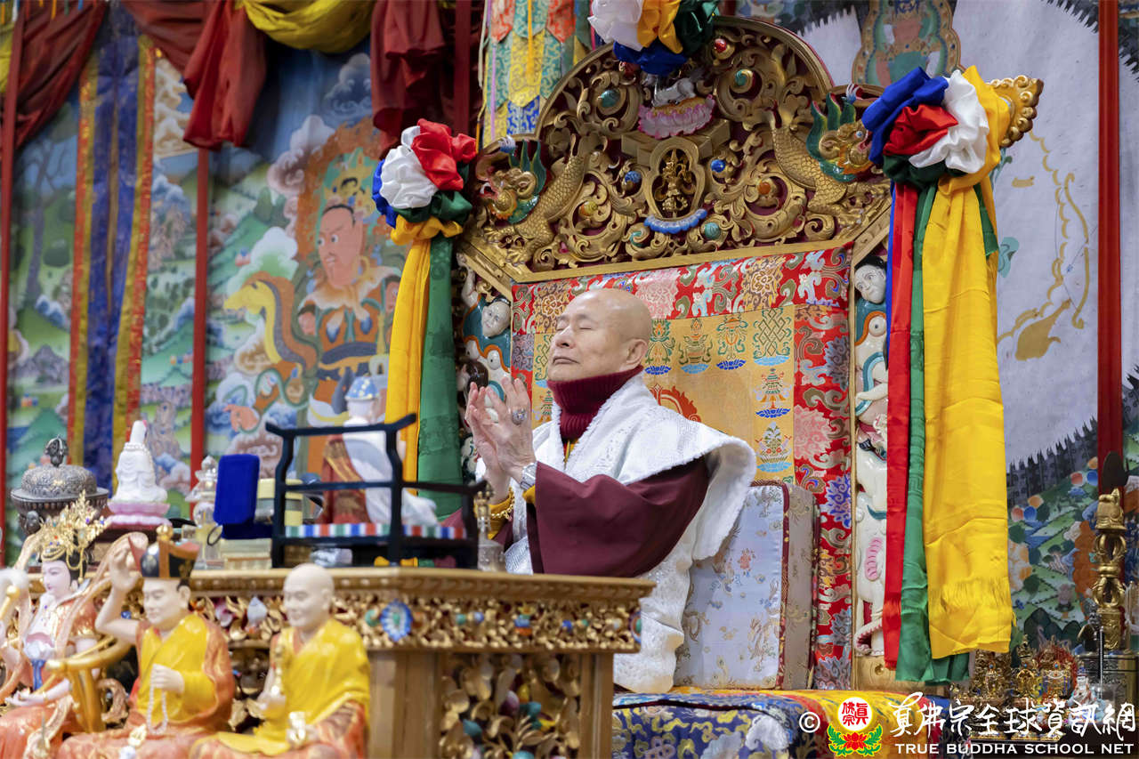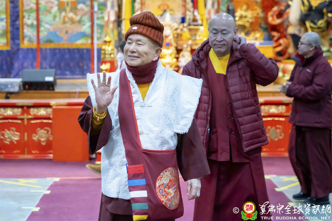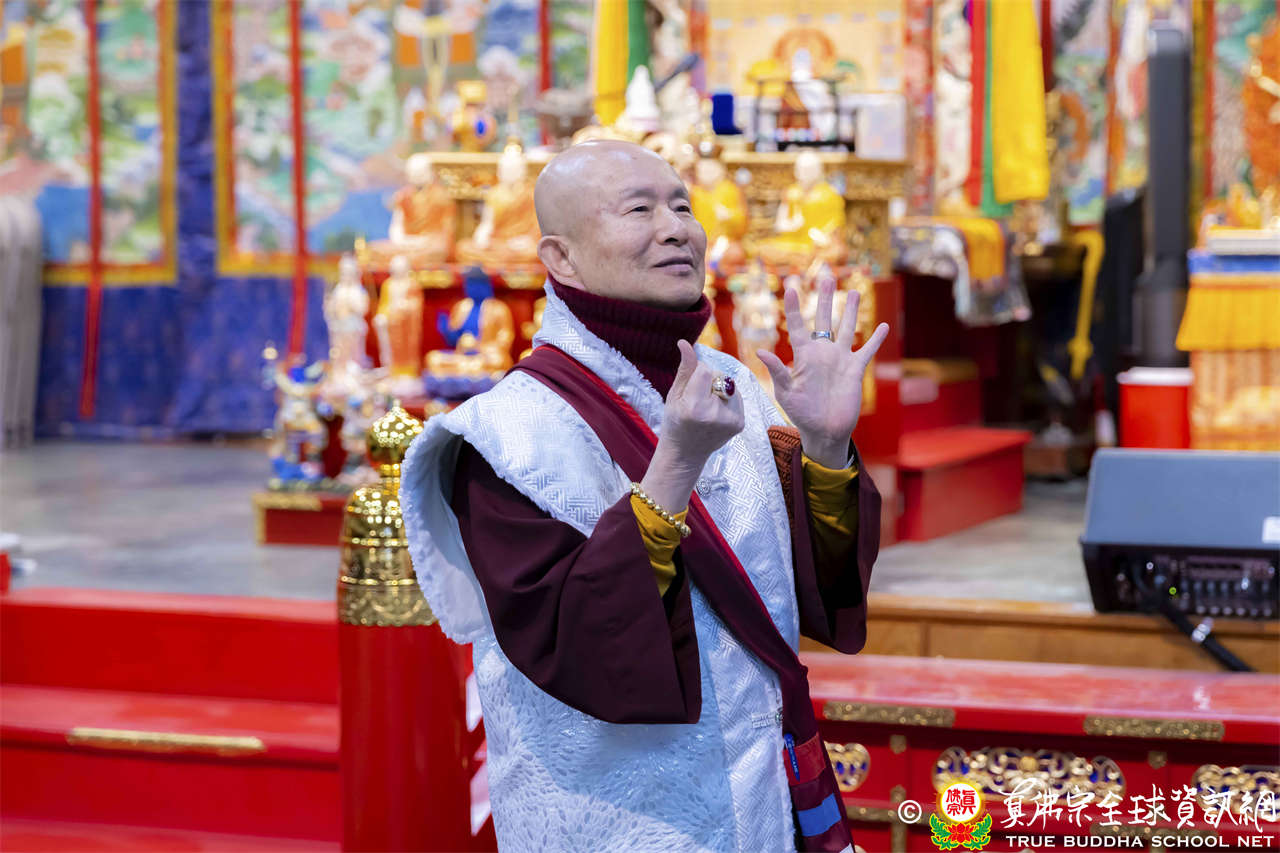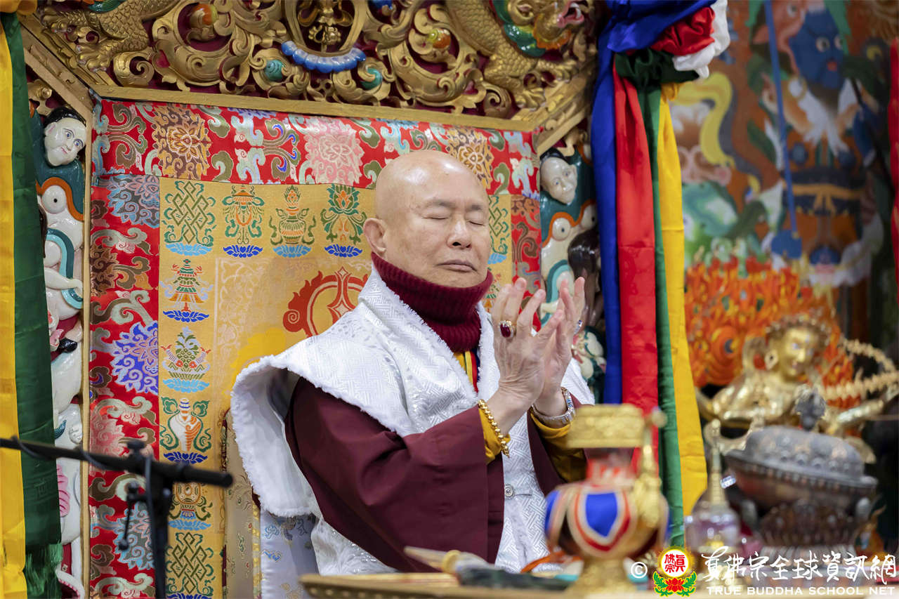 法王開示至此,護摩法會圓滿結束。接著,法王與線上的弟子打招呼,並爲現場出席者賜授觀世音菩薩法灌頂。