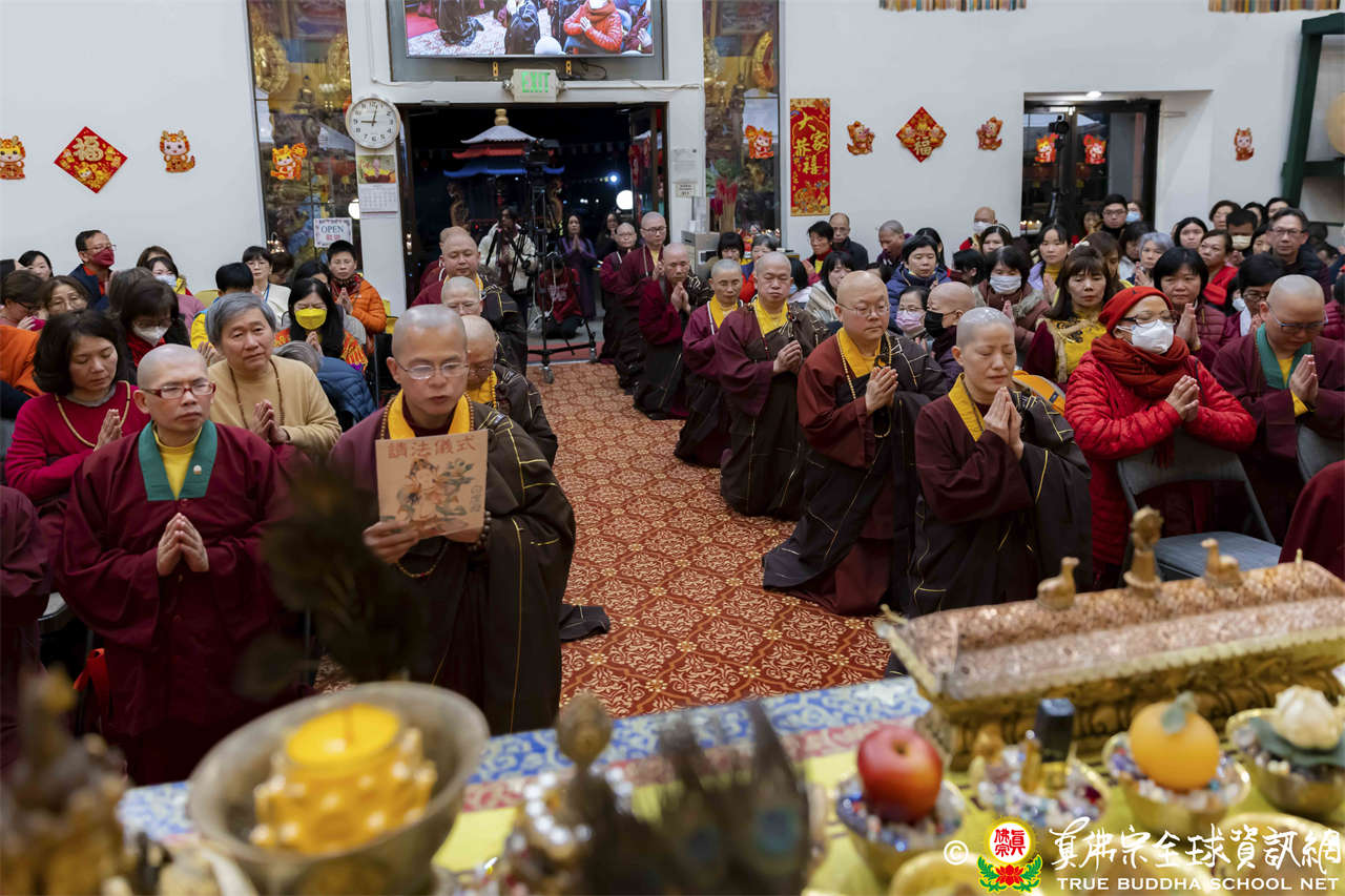 早在除夕之前數個星期,來自世界各地的弘法人員及同門們就不斷湧入西雅圖雷藏寺,滿懷孺慕之情的想和蓮生聖尊盧勝彥、師母一齊歡度除夕及新年。西雅圖雷藏寺張燈結彩,掛滿了喜慶燈籠及各國國旗,並有祝賀詞及吉祥語,希望大眾都有個溫馨難忘的吉祥春節。