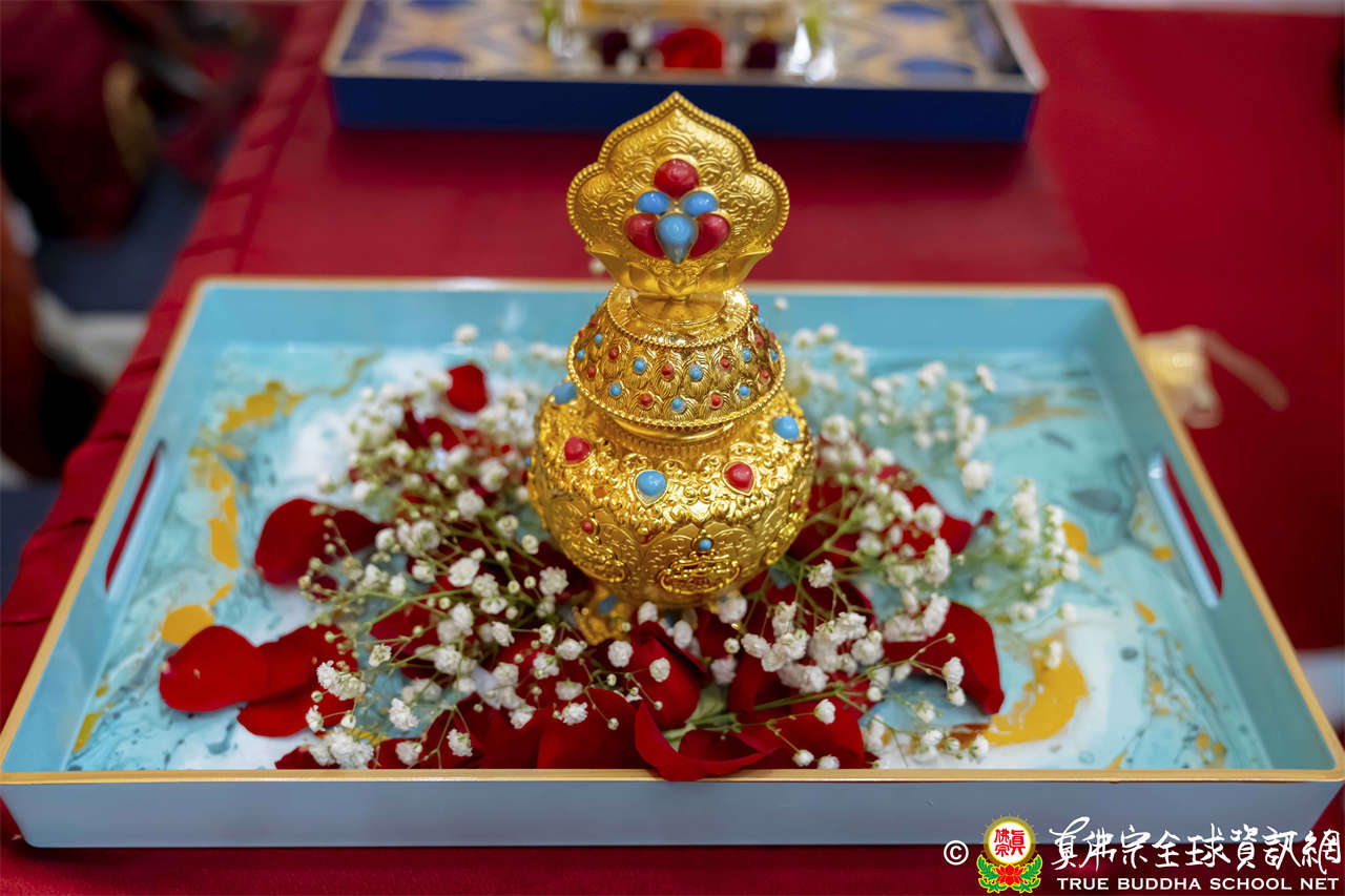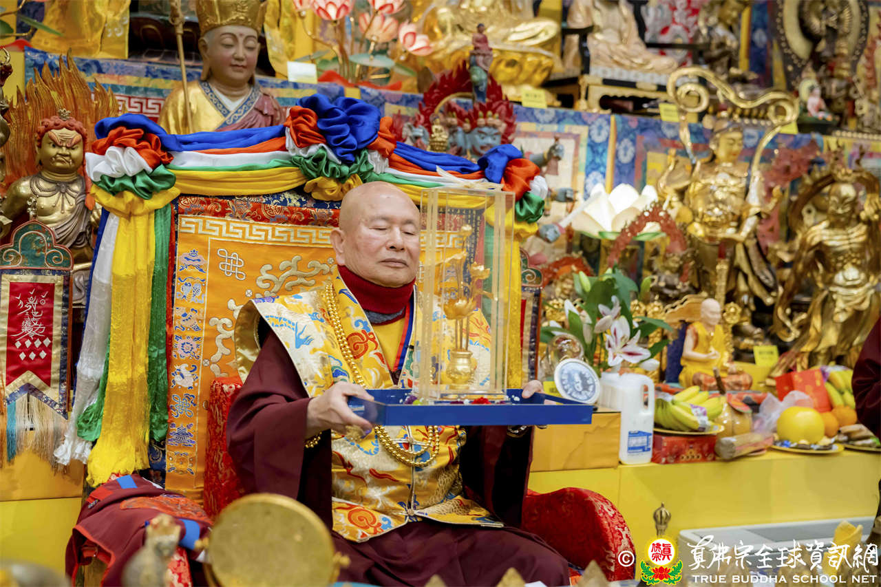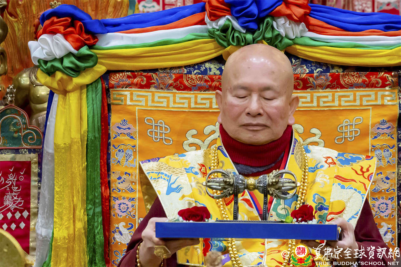 因為今天是大年初一,所以特別有這掃把的灌頂幡,這是只有True Buddha School才有的。一掃煩惱輕,二掃過去的霉運全部除掉,三掃業障消,也就是過了這掃把的灌頂幡後,過去的一切全部掃除乾淨,以後就全部是福分來臨,這是今天晚上最重要的。(大眾熱烈鼓掌)