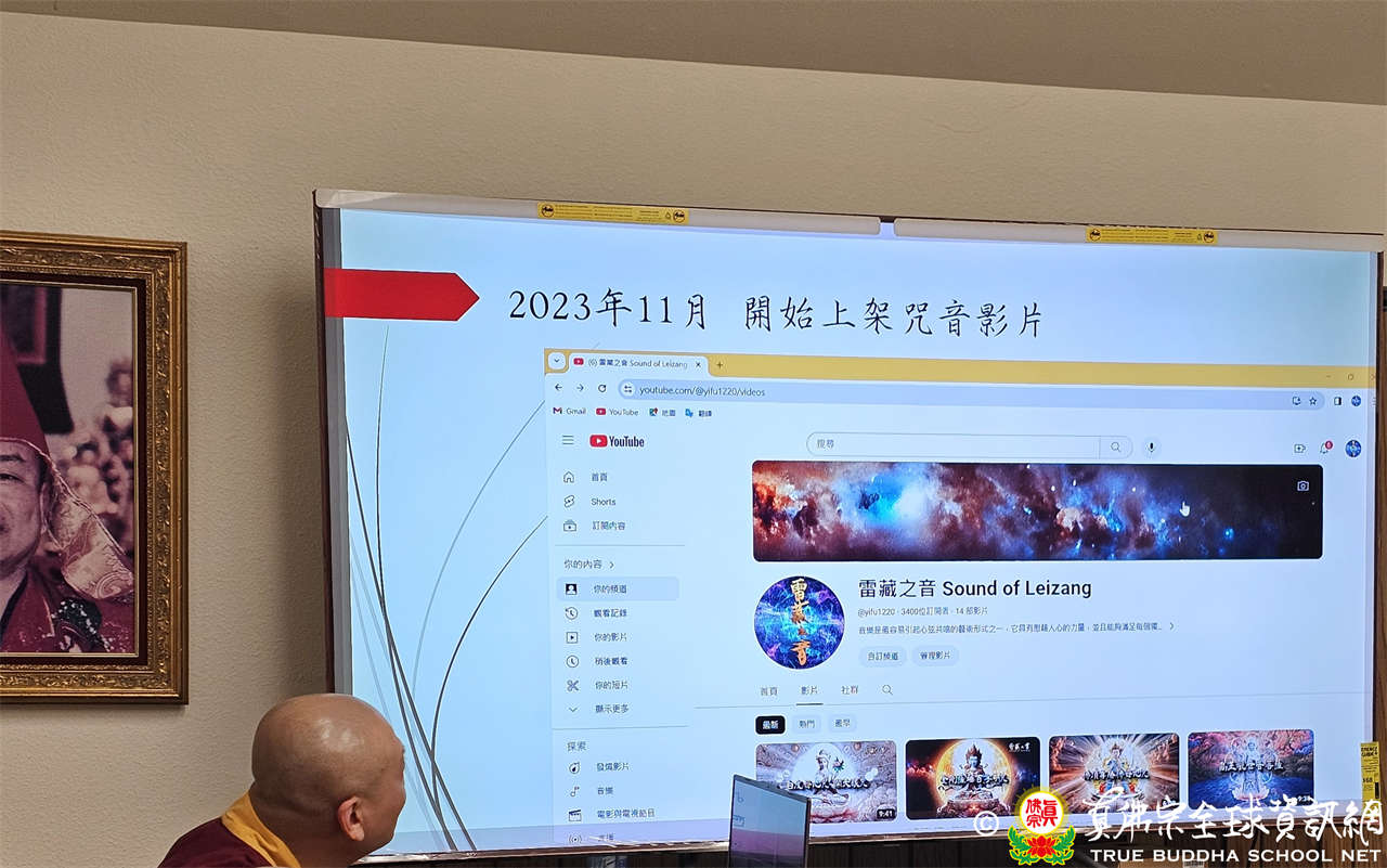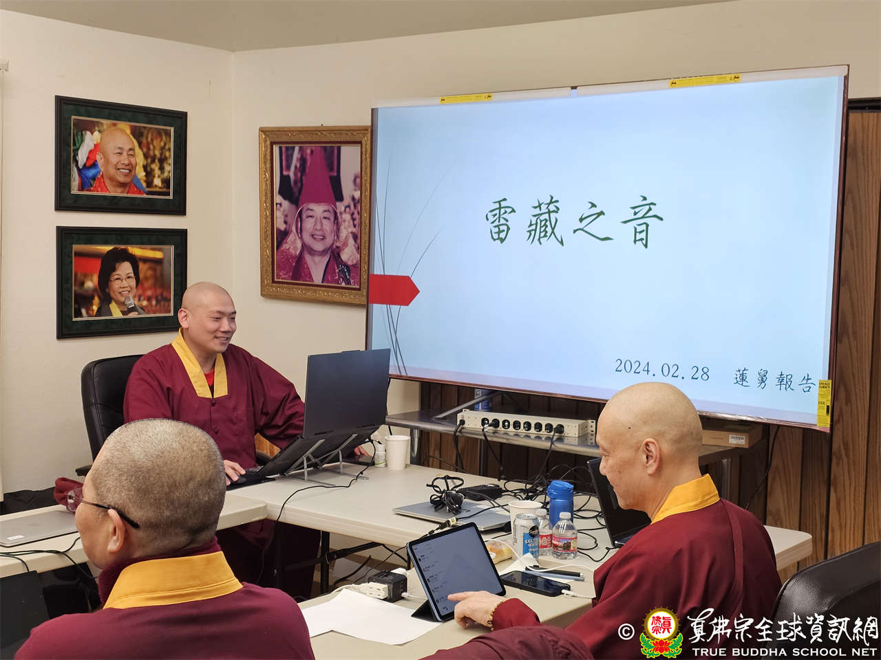 第一天的會議,邀請宗委會加拿大辦事處蓮花少東上師報告加拿大區的道場近況。接著邀請近日獲得師佛讚揚咒音製作單位的「雷藏之音」,由蓮舅上師向處長們報告目前真佛音樂創作平台「雷藏之音」的進度、「雷藏之音」高清HD音質的You Tobe頻道設計,以及未來真佛音樂的推動計劃。