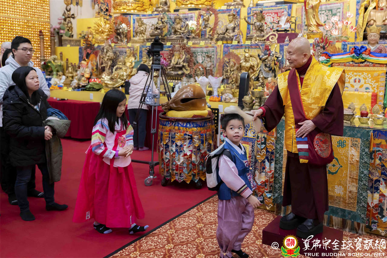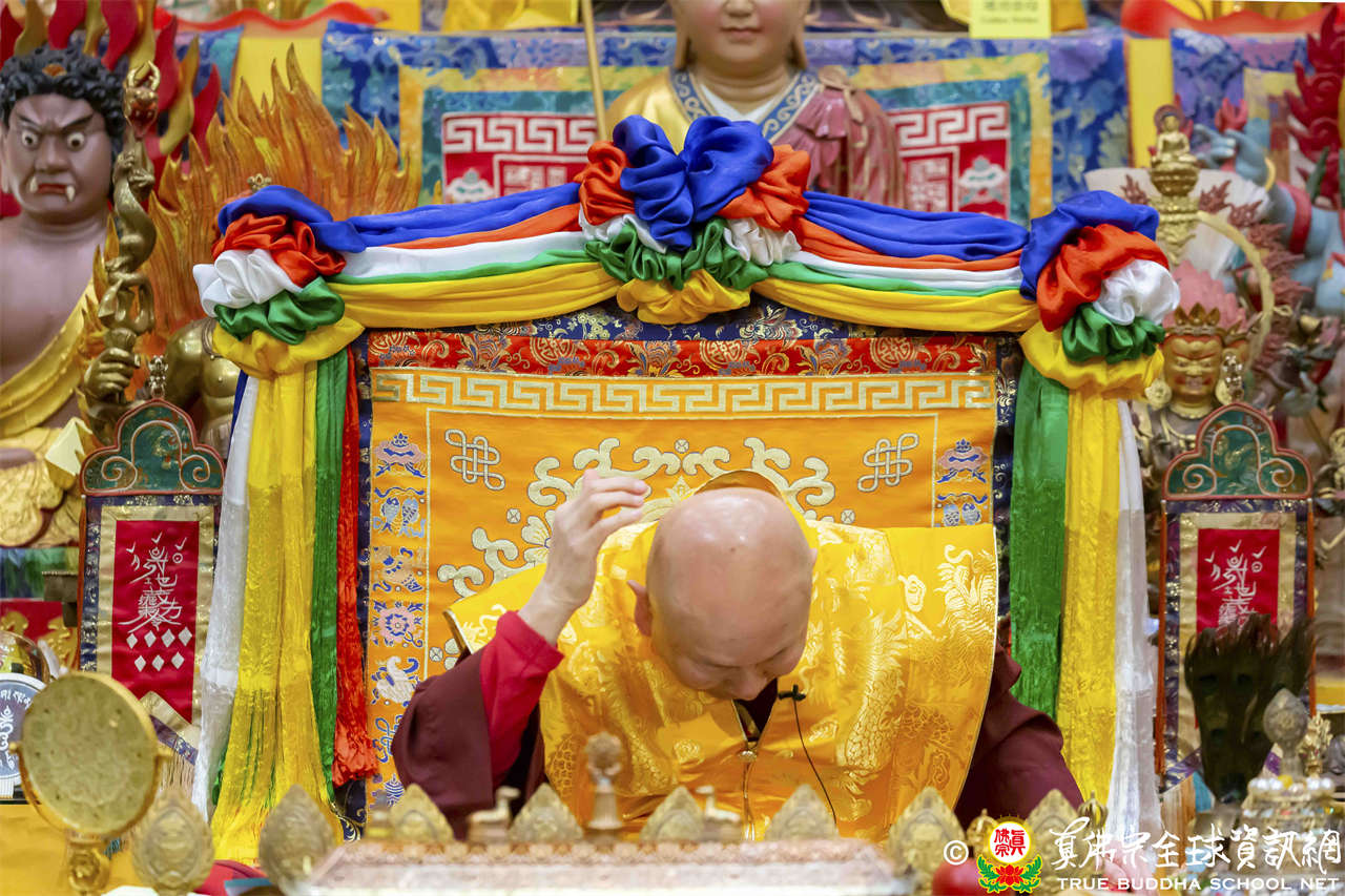 聖尊精彩寶貴的法語開示後,慈悲為新皈依弟子做皈依灌頂、加持大悲咒水、開光佛像,及持拂塵加持與會大眾。