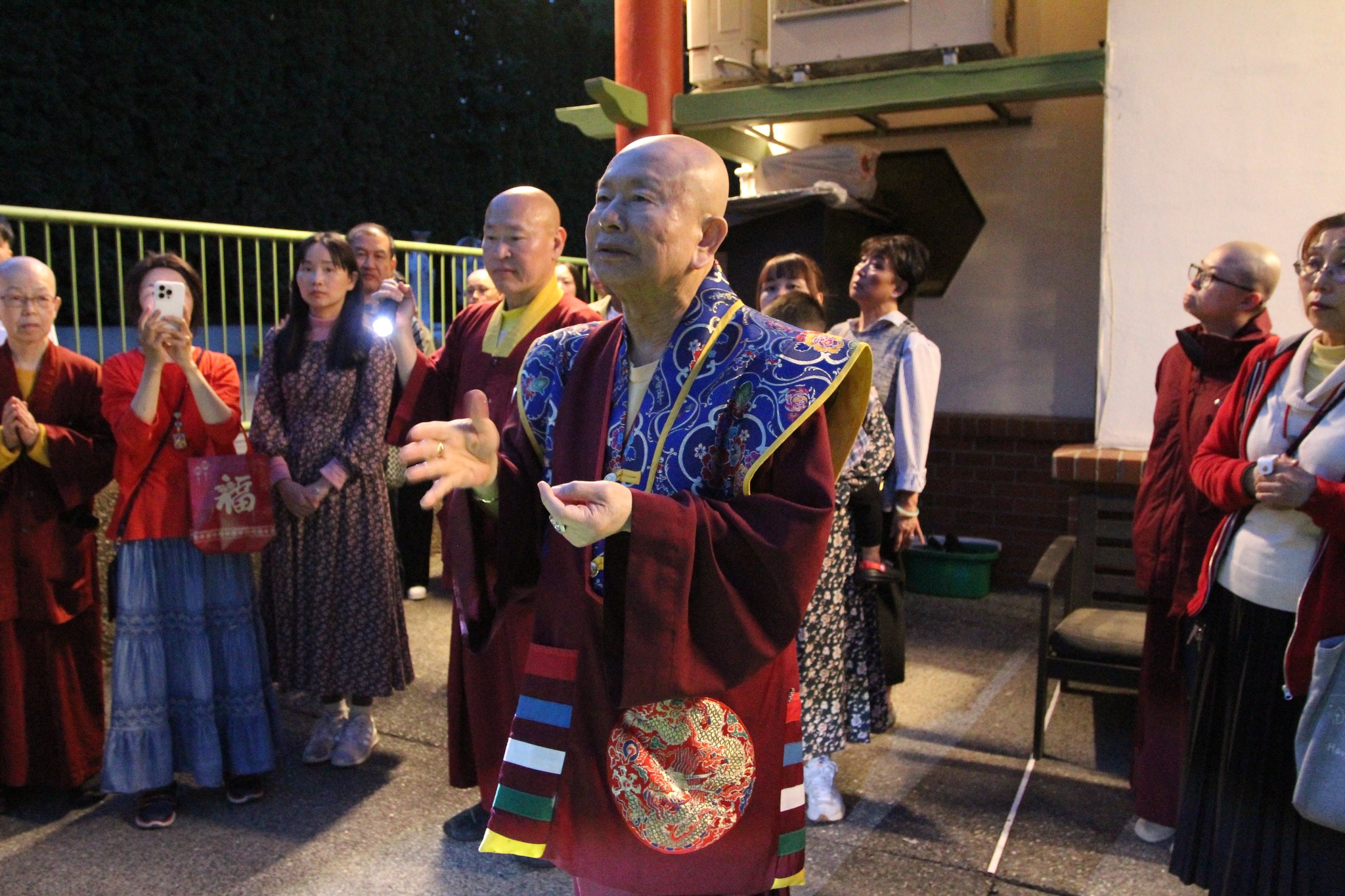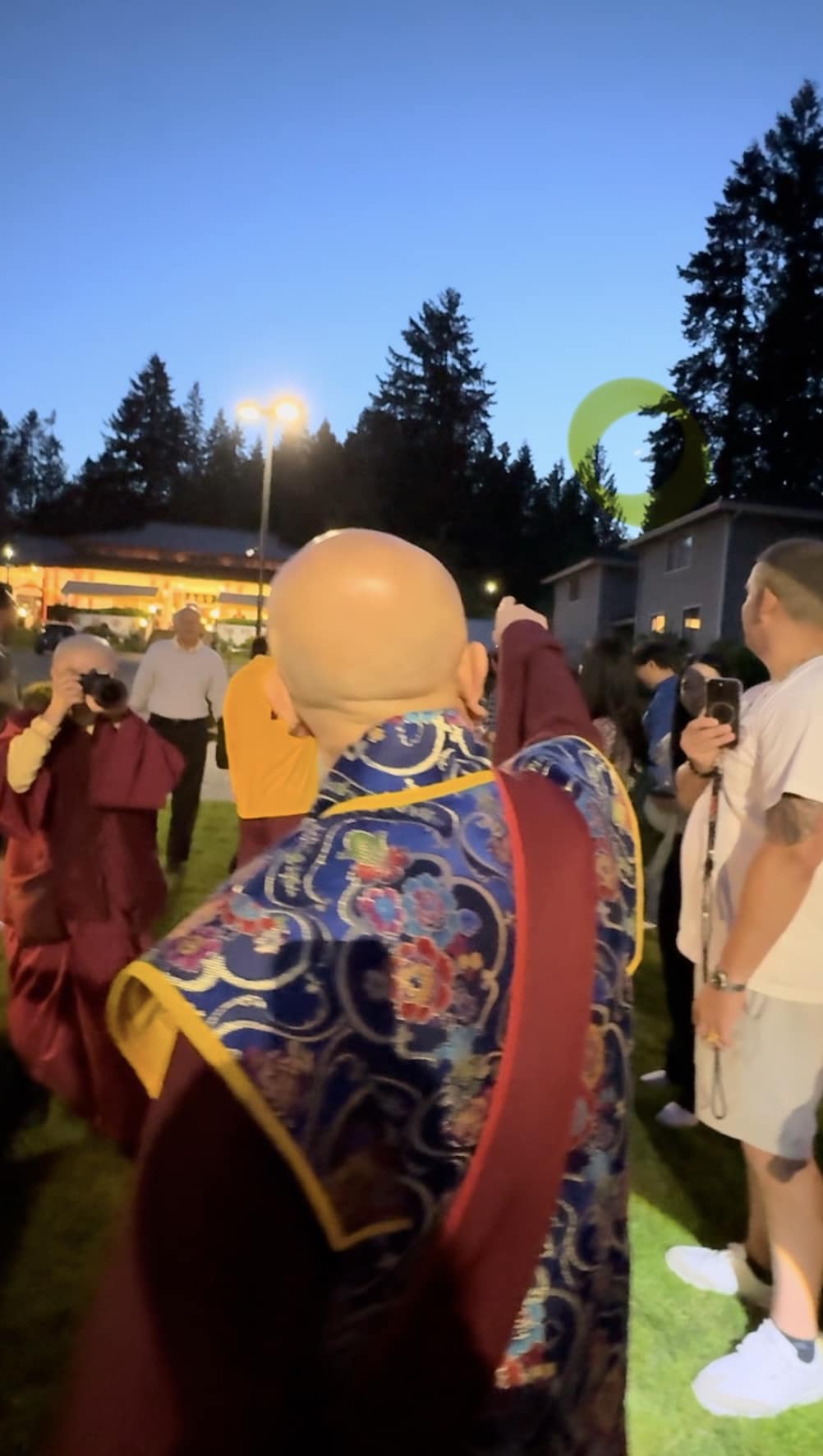 堪輿結束後,師尊回到真佛密苑,在門口與大家談話時,突然問起月亮在哪裡?眾人紛紛仰望夜空找尋,只見明亮的下弦月正好掛在剛剛師尊所點的月下老人祠處的上空,眾人驚訝不已,直呼相應了!師尊說,真的是月下老人耶!將來想求婚姻的都可以來求月下老人,得到紅線有個好姻緣。