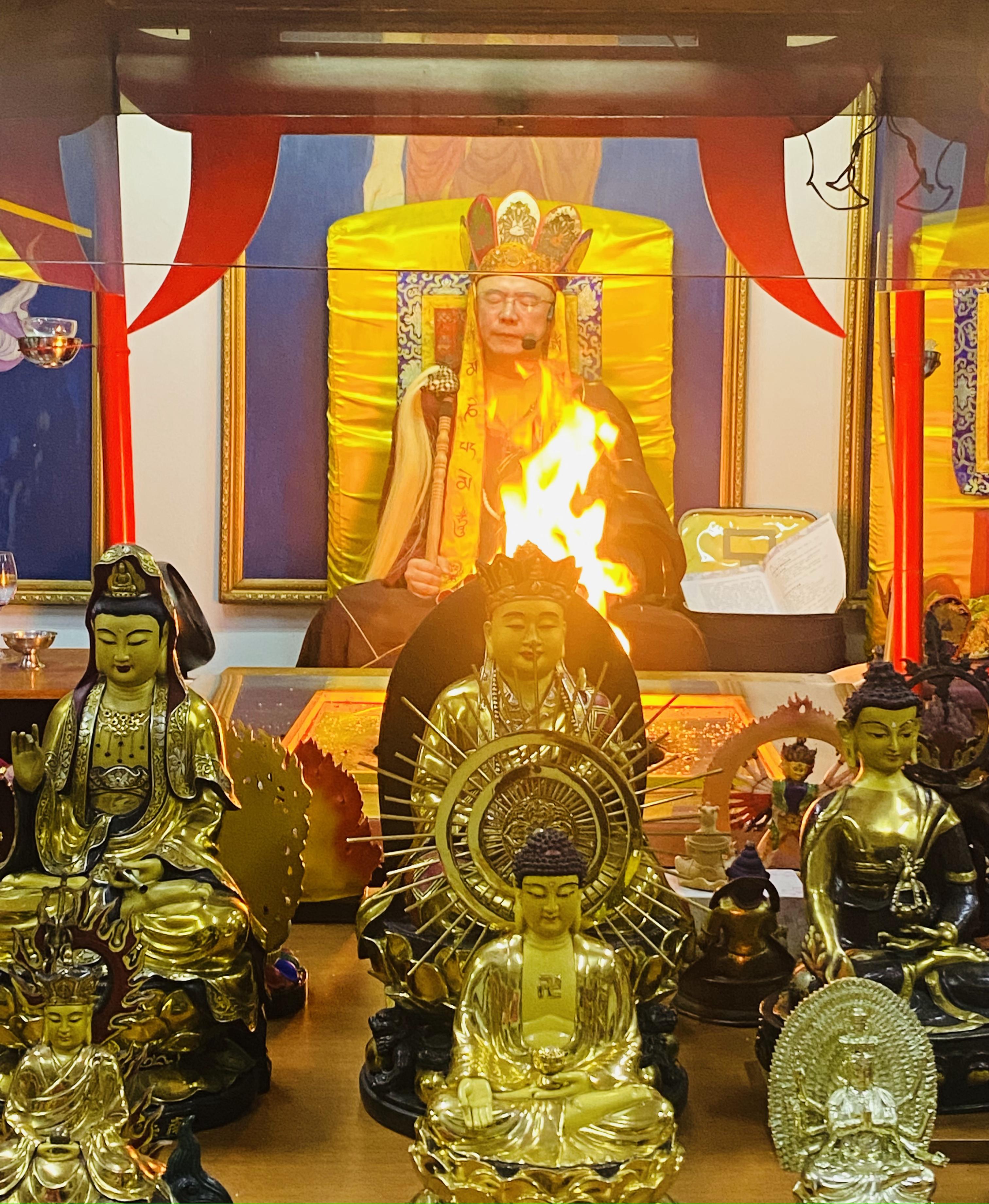 蓮訶上師於2024年4月29日在巴西真諦雷藏寺主壇專壇「請佛住世瑤池金母護摩」,迴向師佛: