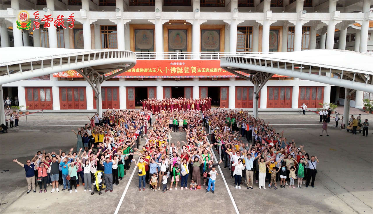開示結束後,大家依照蓮歐上師的指揮,眾人移動至廣場,為賀"喜慶 聖壽跨80 文集越300 ",在工作人員的引導下,約600人的開心熱情地依序排序出"80 "及"300 "之畫面,甚視壯觀。在法王的大加持下,原本稍微陰暗的天氣,轉成陽光普照、天氣宜人,在眾人齊心、歡樂的氣氛下,圓滿完成。