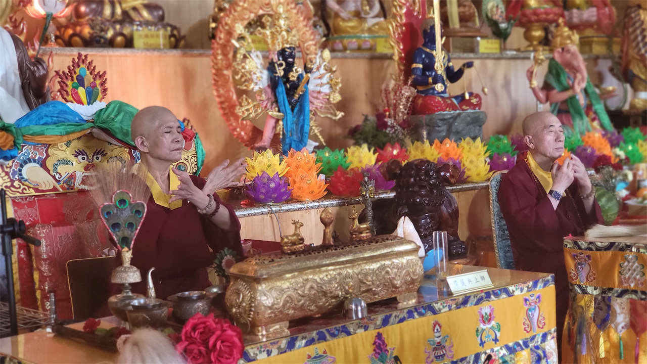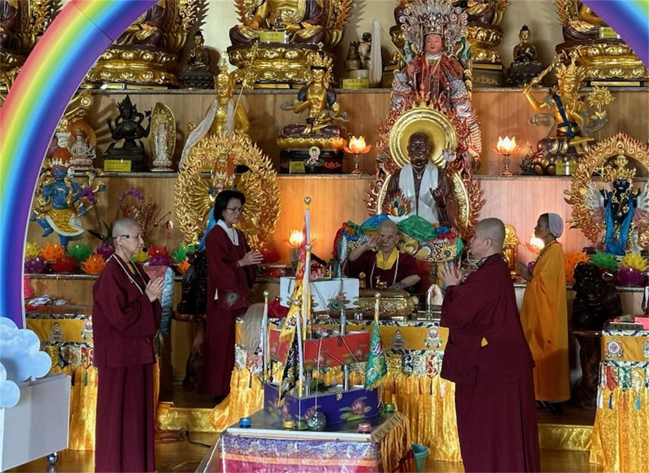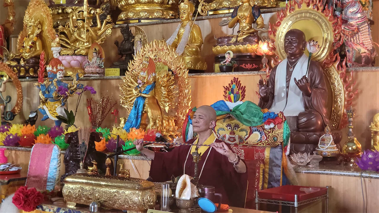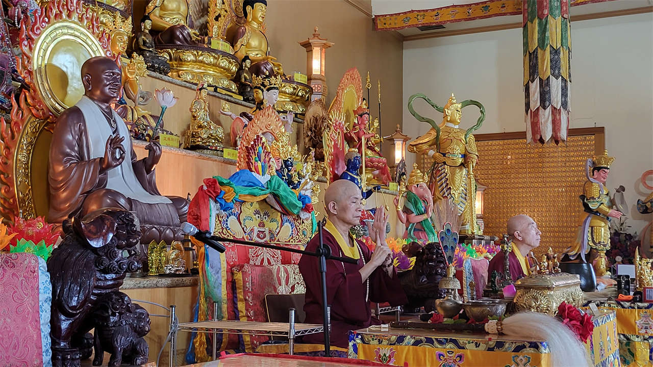 釋蓮央金剛上師於2024年5月19日在美國達拉斯三輪雷藏寺主壇專壇「請佛住世瑤池金母水供」,迴向師佛: