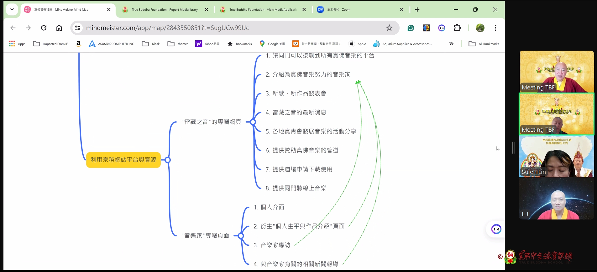 首先,蓮僧長老說明,在西宗辦常會收到來自許多熱愛音樂的同門,將自己的創作供養師佛。師佛私下亦有指示,可以創建平台提供給這些音樂愛好者發揮。目前雷藏之音對於諸尊心咒的音樂創作頗受好評,在youtube頻道的點閱率也逐次增加,接下來就是對於個人創作的項目。於是將規劃透過宗務網站的資源,建立雷藏之音的專屬網頁,發揮真佛音樂協作/創作平台功能。所以本次的討論內容,不僅是雷藏之音現階段諸尊心咒的創作,亦含括甄選個人的優良創作。