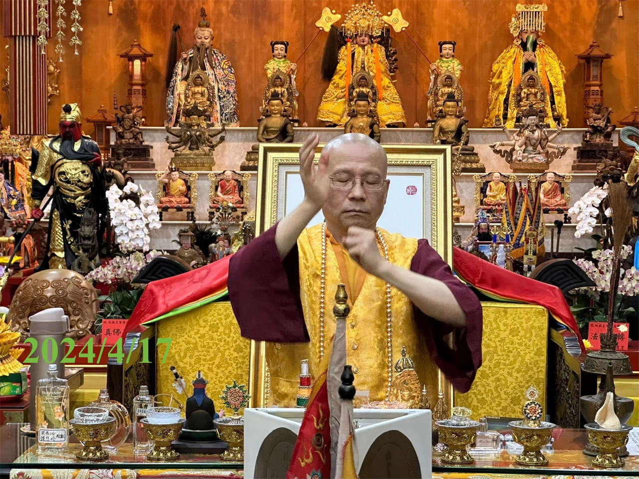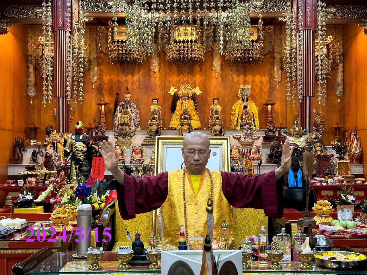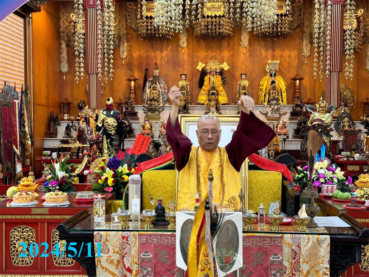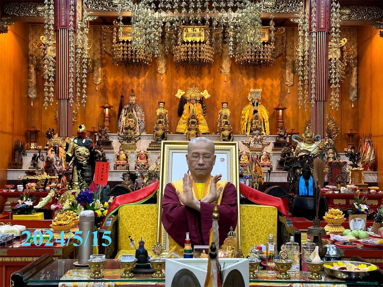 釋蓮郲上師於2024年4月17日、4月20日、5月8日、5月11日、5月15日、5月18日、5月22日在台灣金極雷藏寺主壇專壇「請佛住世瑤池金母水供」,迴向師佛: