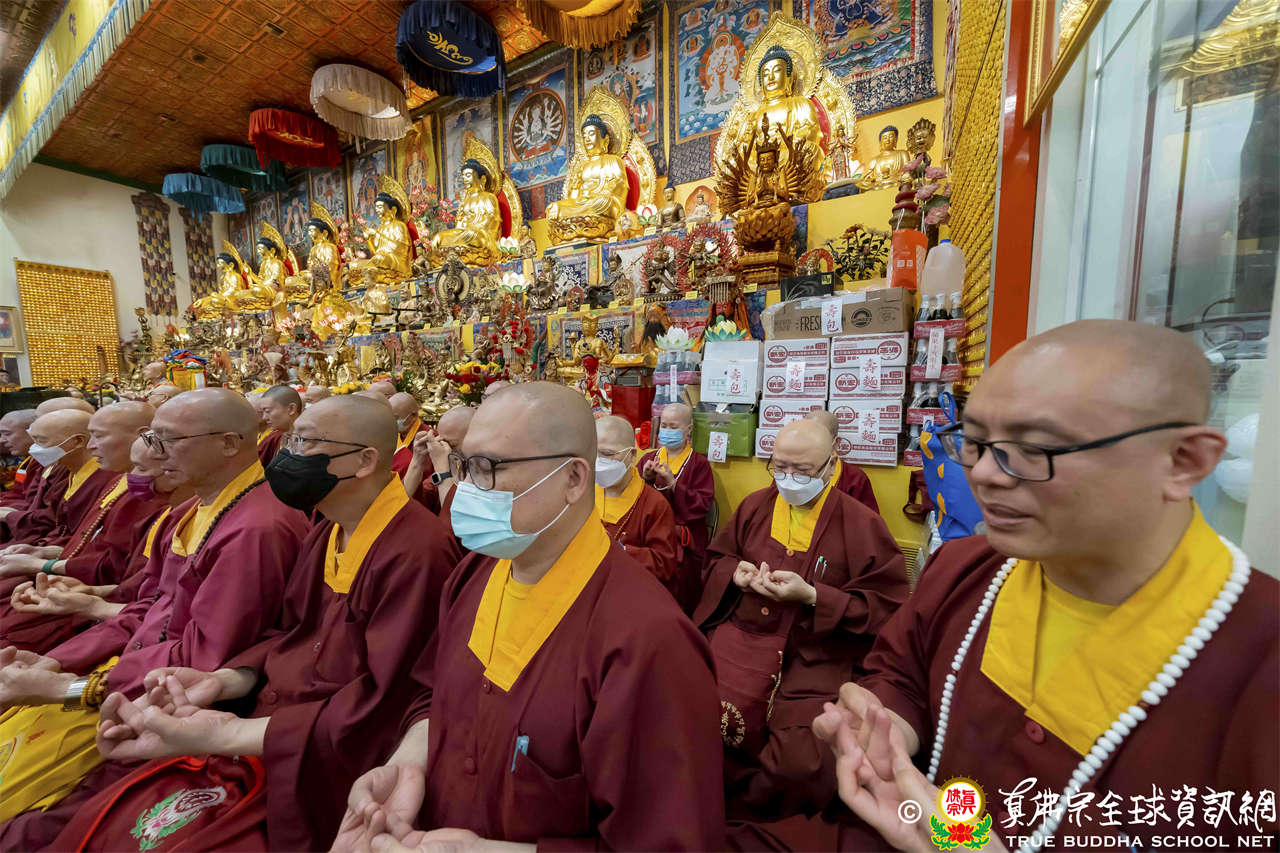 八點整,在蓮花童子的咒音中,恭迎聖尊蓮生活佛盧勝彥蒞臨殿內帶領四眾弟子共修黃財神本尊法。
