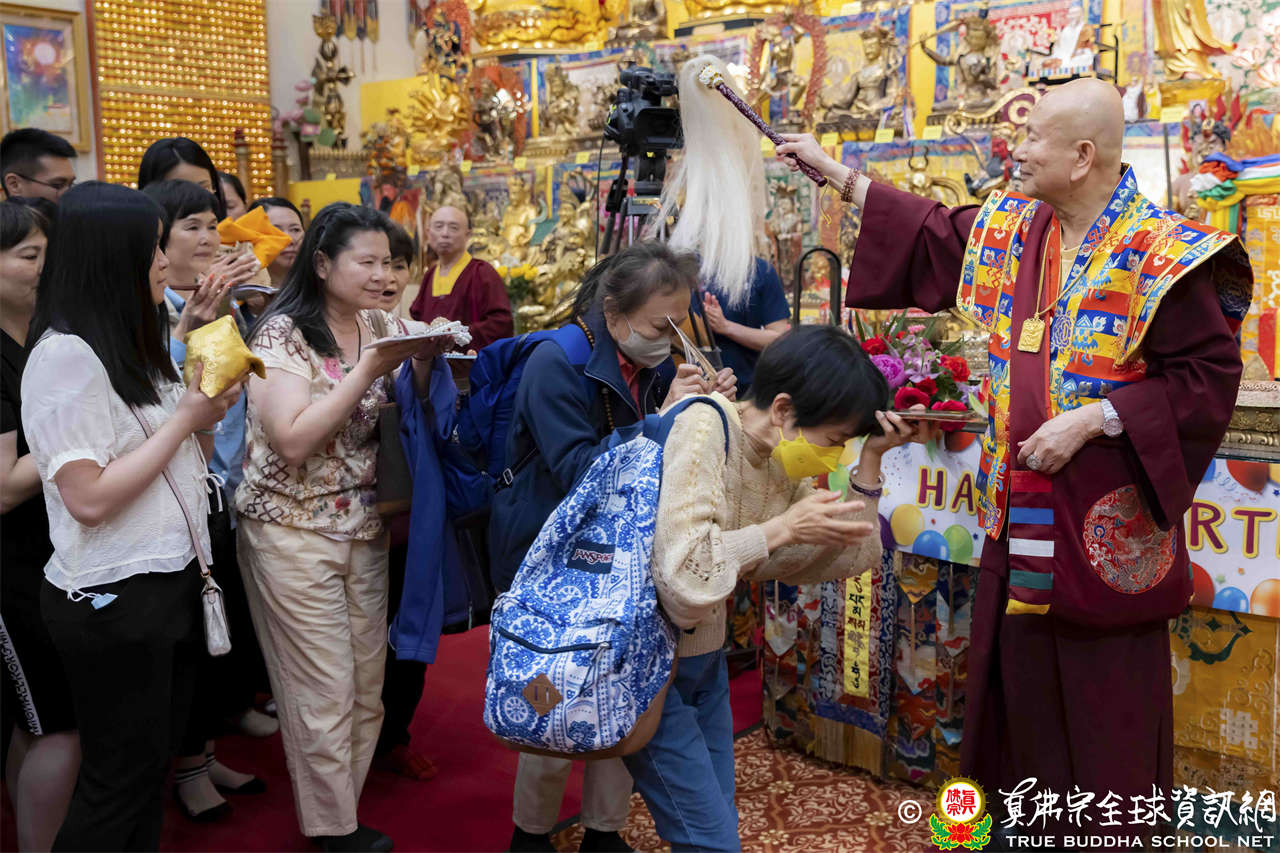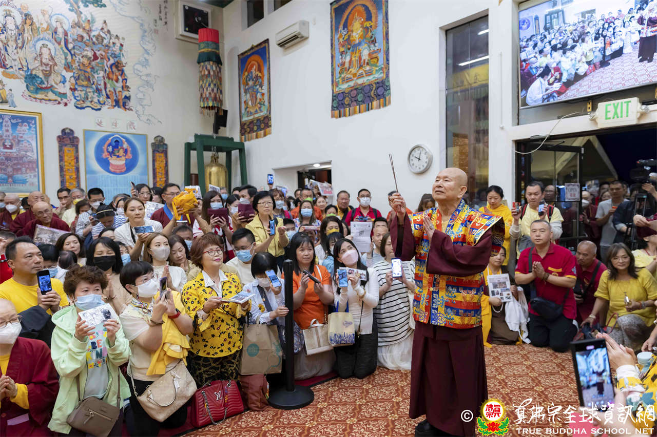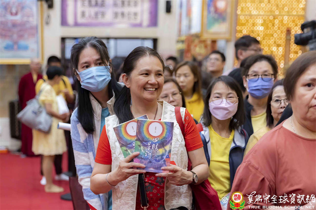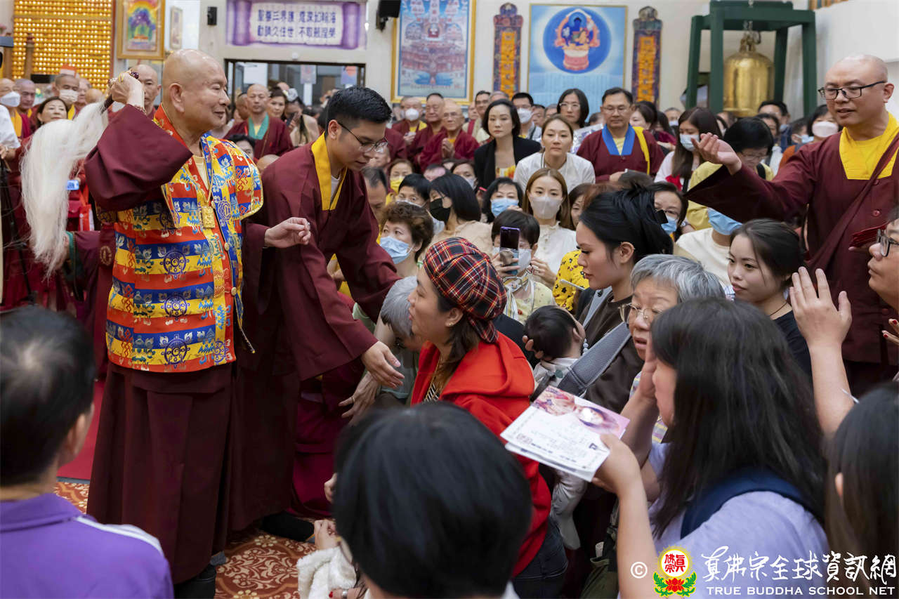 在拂塵賜福加持後,師尊不辭辛勞地為大眾簽書,大殿內外擠滿排隊人潮,最後每個人都得到師尊珍貴的簽名與壽桃、紅龜粿,幸福滿載盡興而歸。感恩根本上師倒裝下生辛勤的救度眾生!師佛所傳授的真佛密法其珍貴性是無法用世間任何寶物來換取的,弟子們誠心祈願師佛佛體安康、請佛住世、長壽自在、利樂人天。