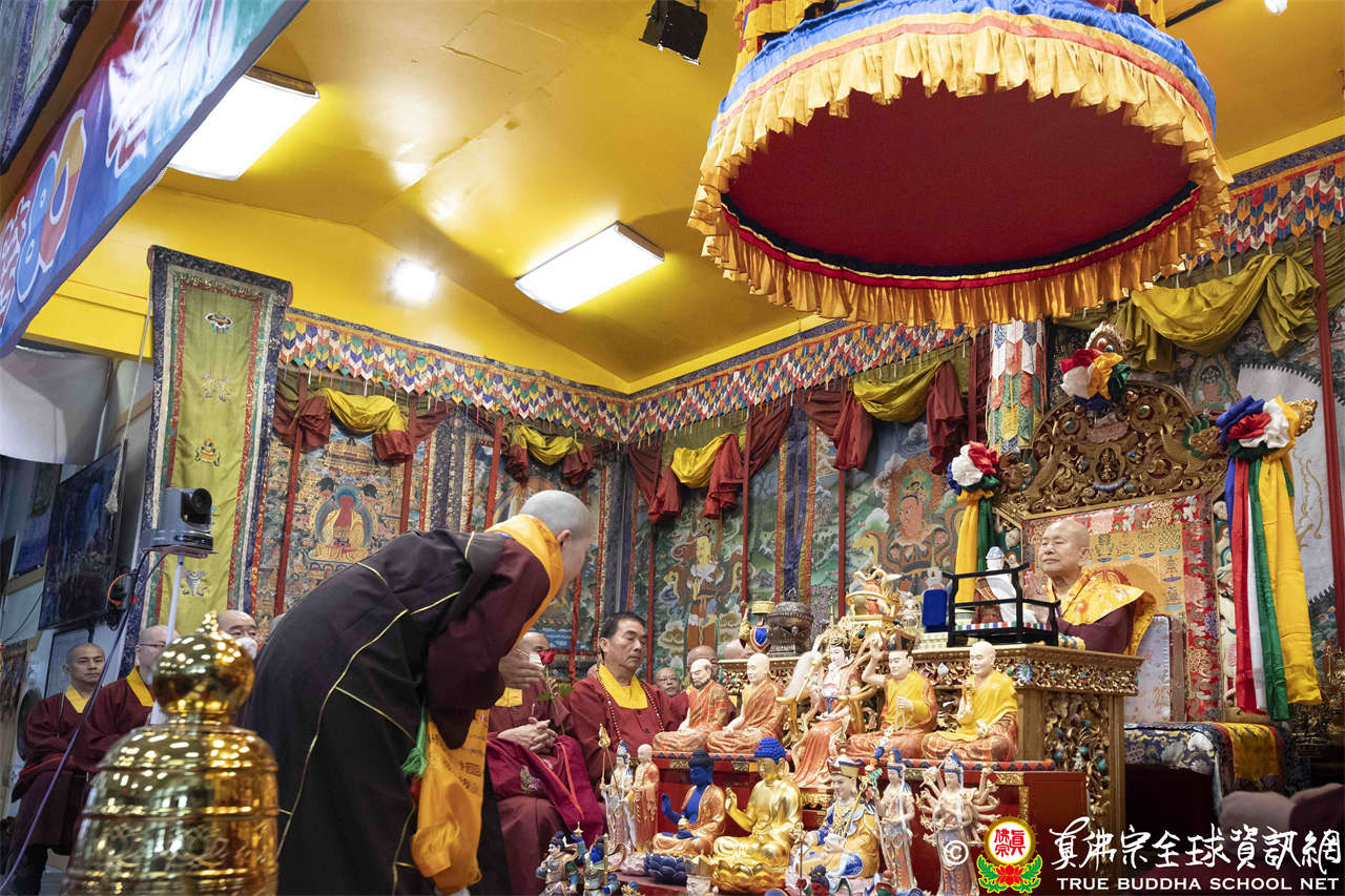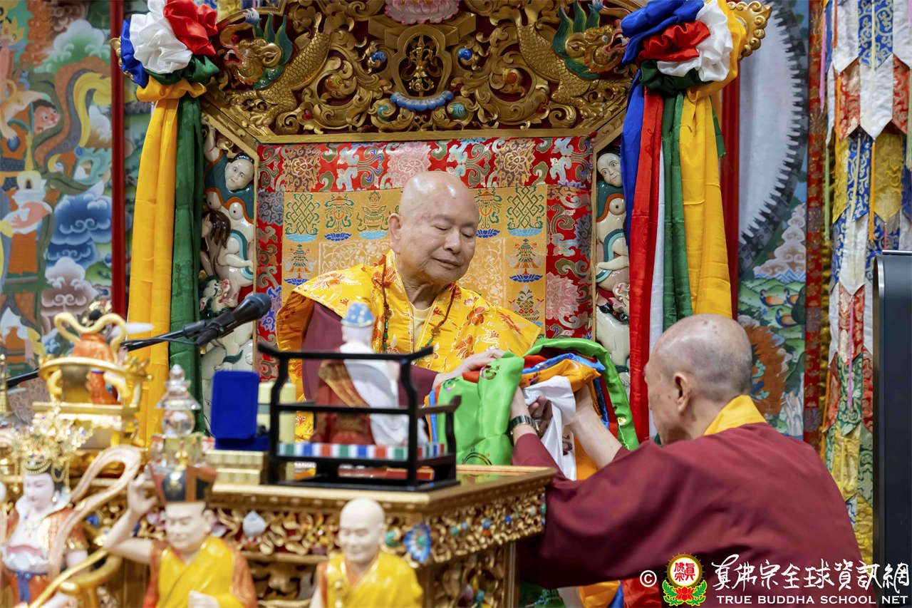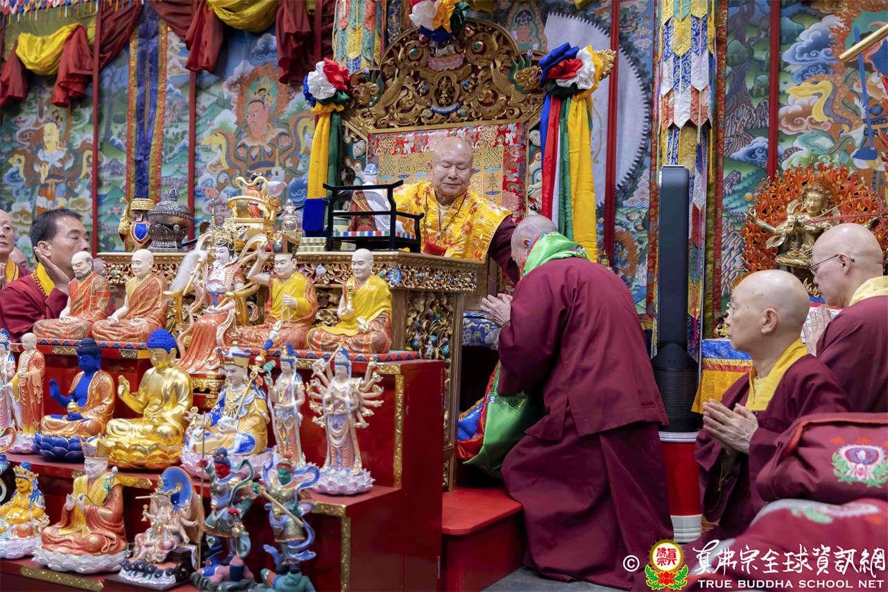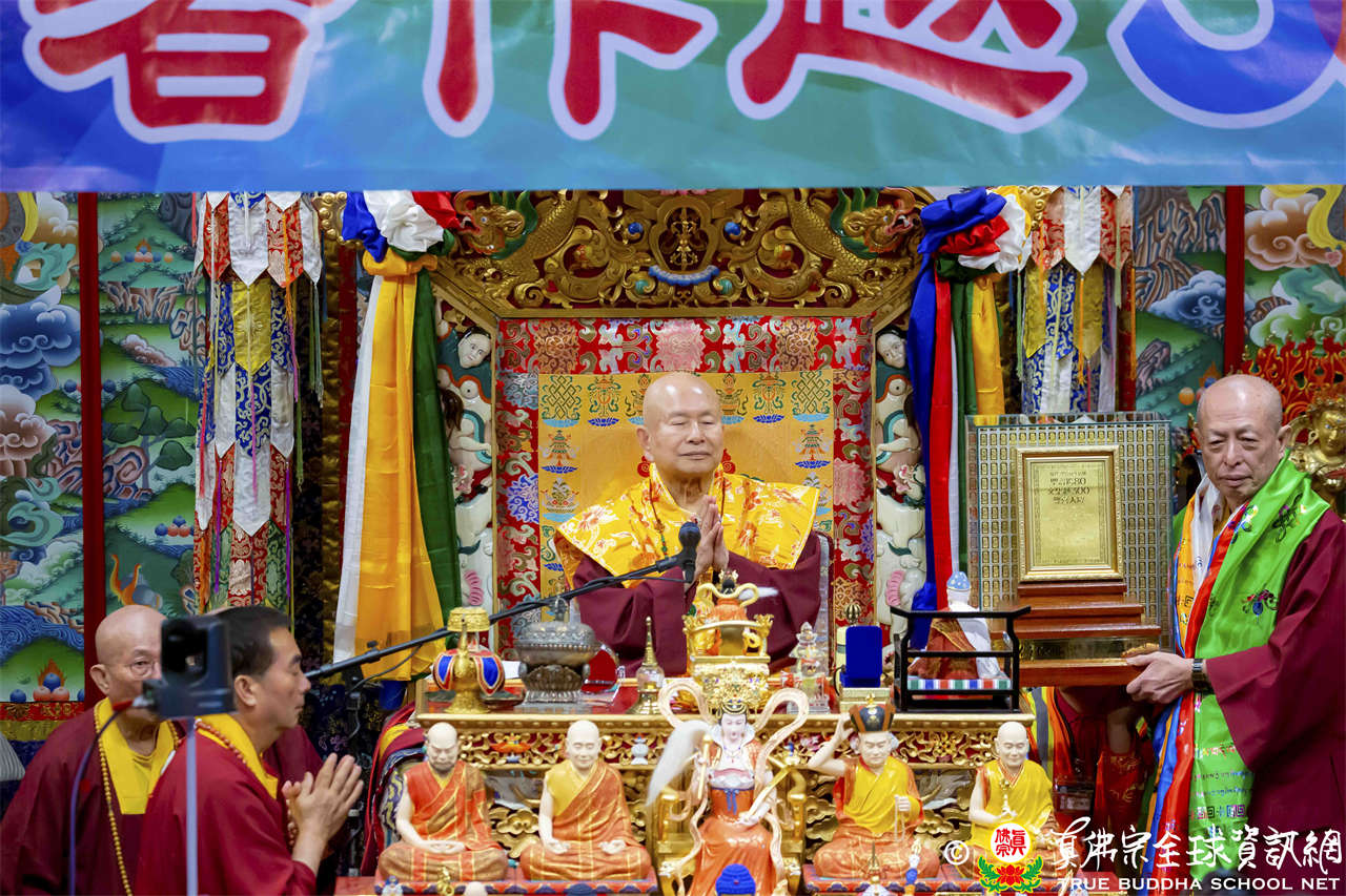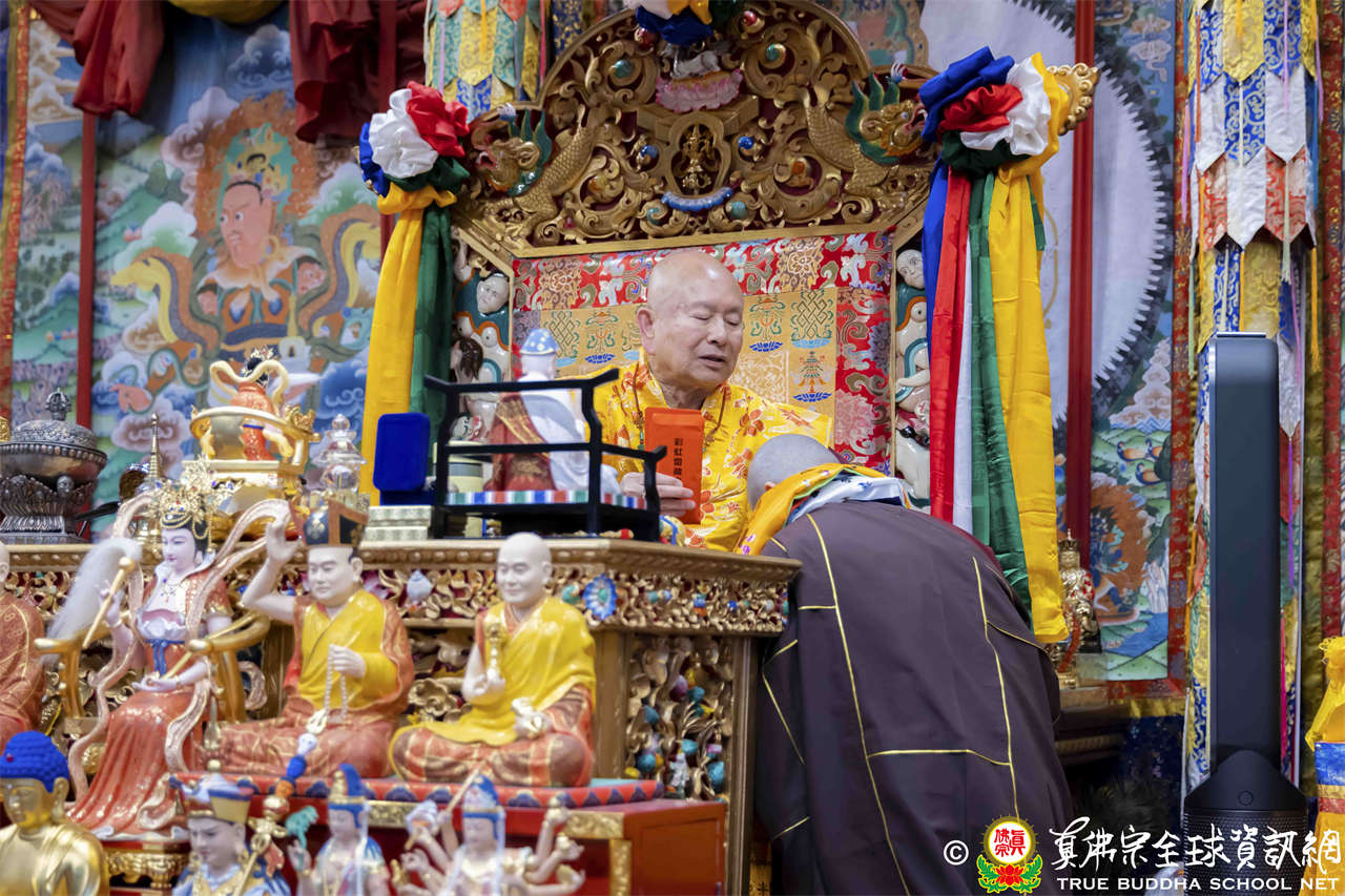 接著請世界真佛宗宗務委員會長蓮花程祖上師、處長們及彩虹雷藏寺住持蓮彥上師、西雅圖雷藏寺代表碧珍上師、台灣雷藏寺住持蓮哲上師出列,頂禮根本上師及壇城三寶,並由會長蓮花程祖上師,代表全球真佛弟子,敬獻賀禮供養真佛宗創辦人無上法王聖尊蓮生活佛。
