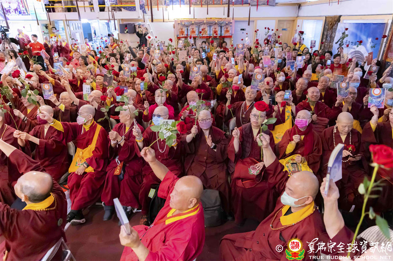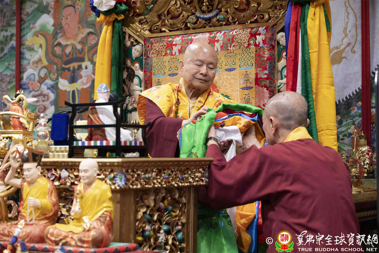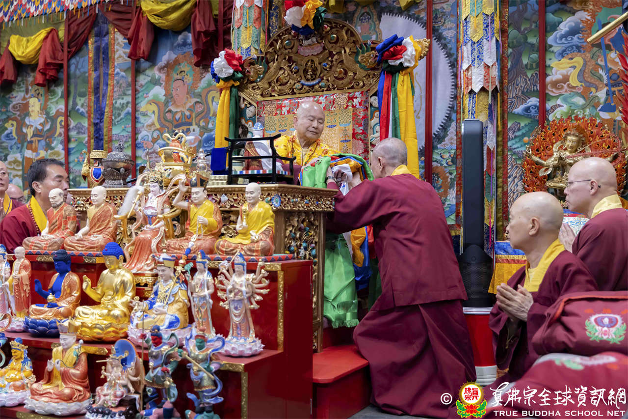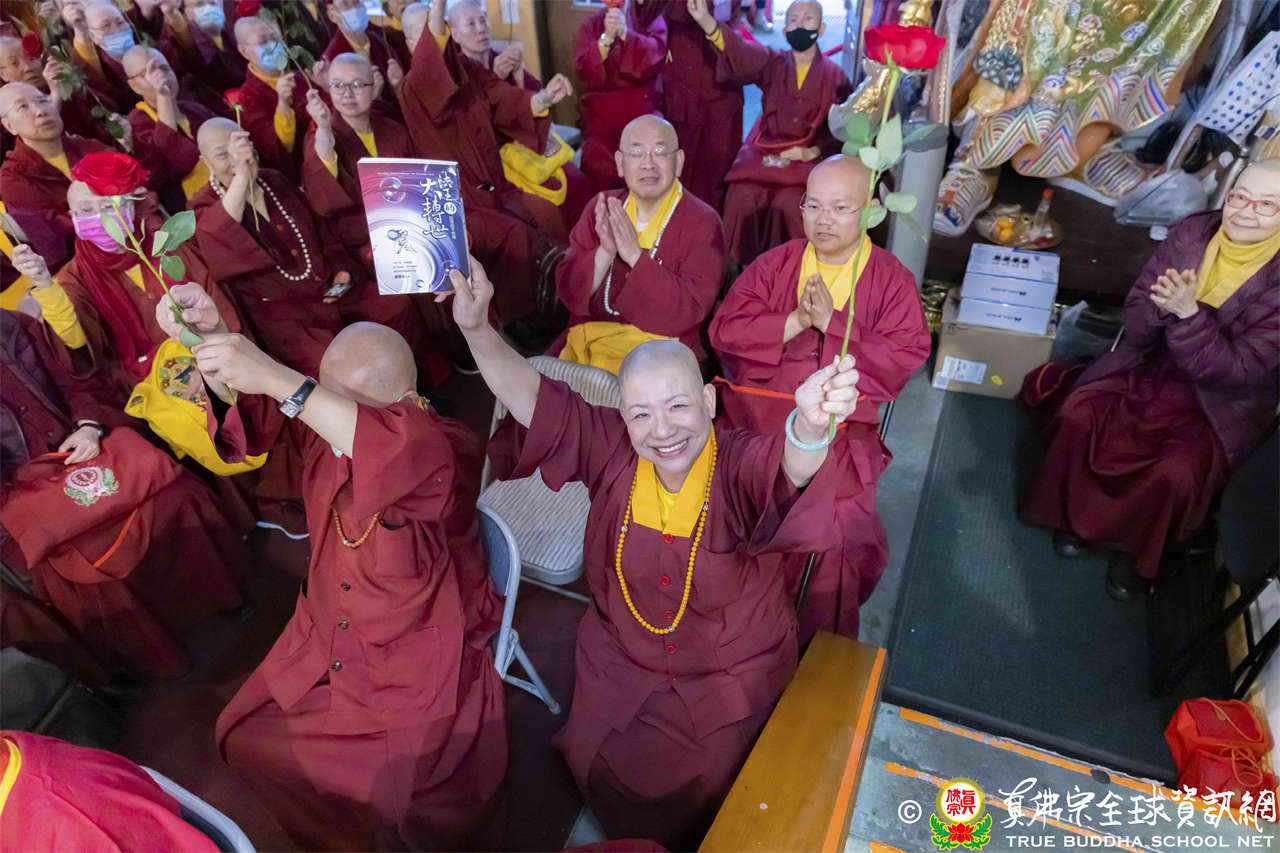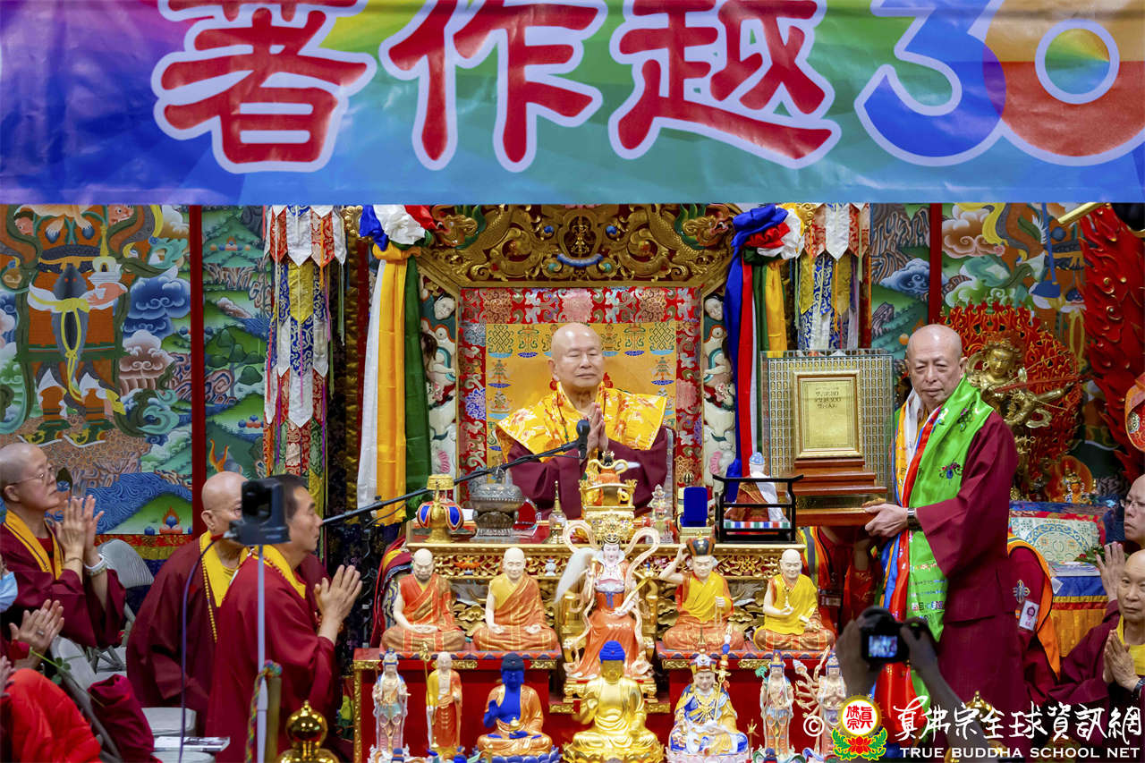 接著請世界真佛宗宗務委員會長蓮花程祖上師、處長們及彩虹雷藏寺住持蓮彥上師、西雅圖雷藏寺代表碧珍上師、台灣雷藏寺住持蓮哲上師出列,頂禮根本上師及壇城三寶,並由會長蓮花程祖上師,代表全球真佛弟子,敬獻賀禮供養真佛宗創辦人無上法王聖尊蓮生活佛。