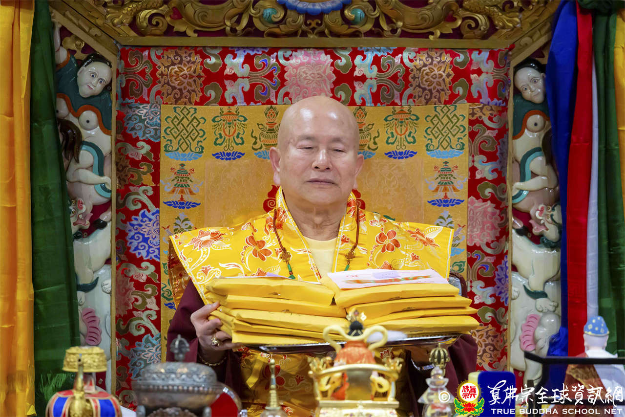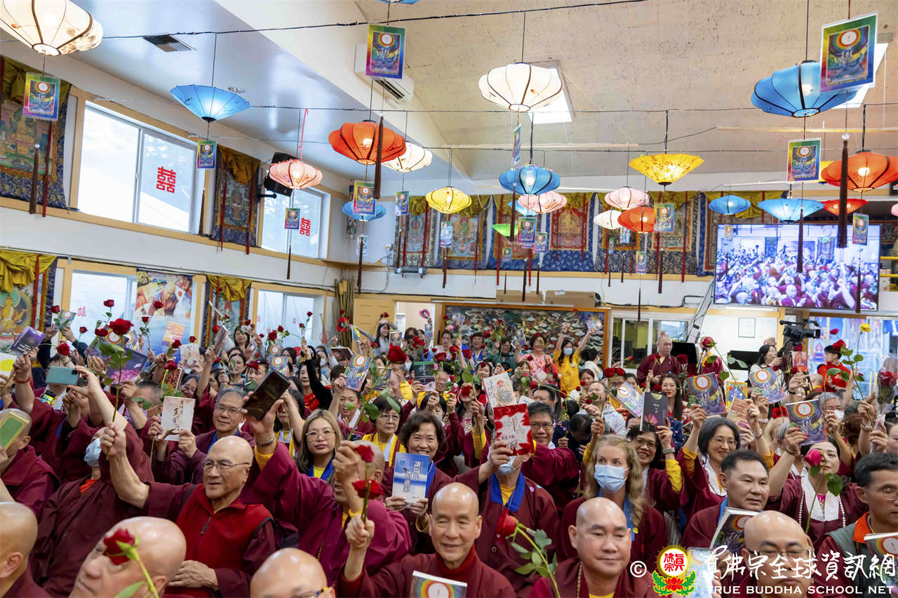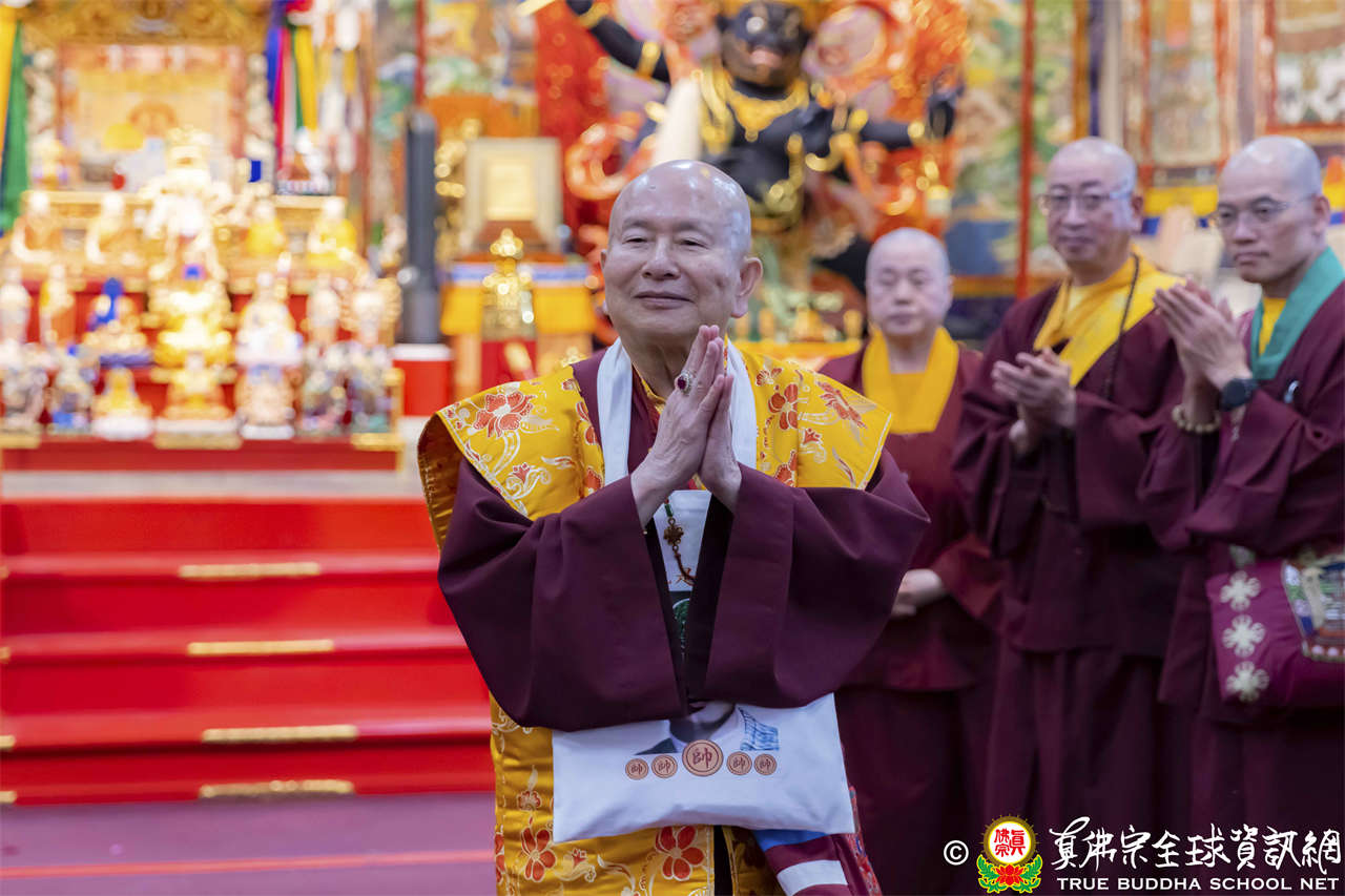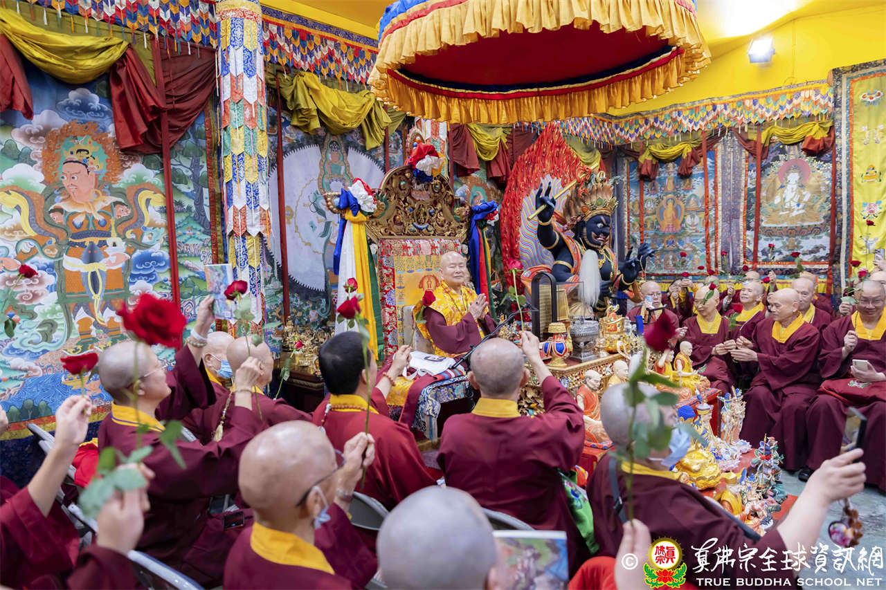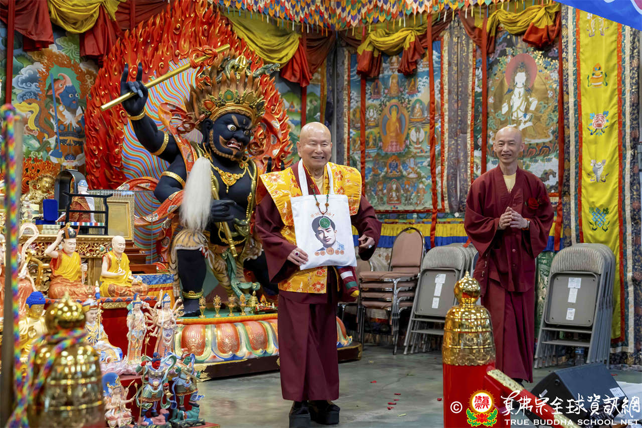 接著請世界真佛宗宗務委員會長蓮花程祖上師、處長們及彩虹雷藏寺住持蓮彥上師、西雅圖雷藏寺代表碧珍上師、台灣雷藏寺住持蓮哲上師出列,頂禮根本上師及壇城三寶,並由會長蓮花程祖上師,代表全球真佛弟子,敬獻賀禮供養真佛宗創辦人無上法王聖尊蓮生活佛。