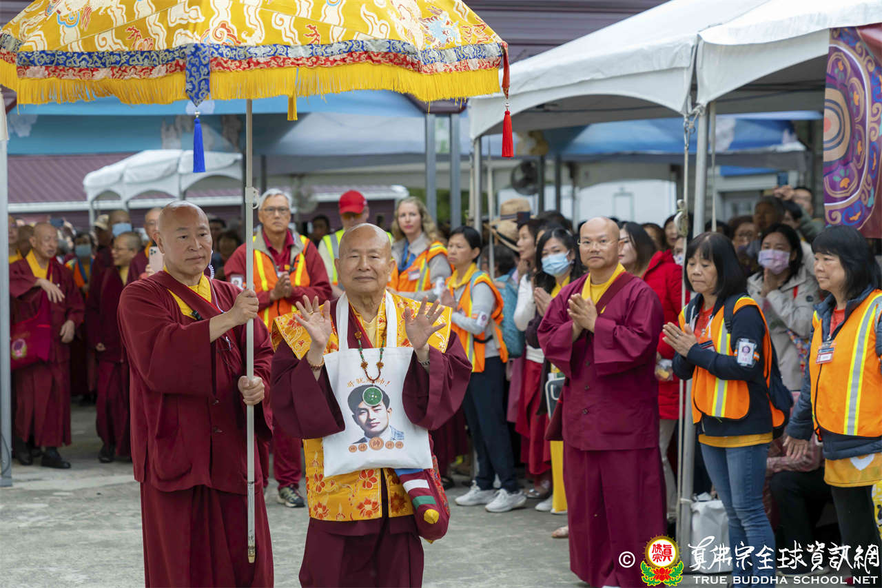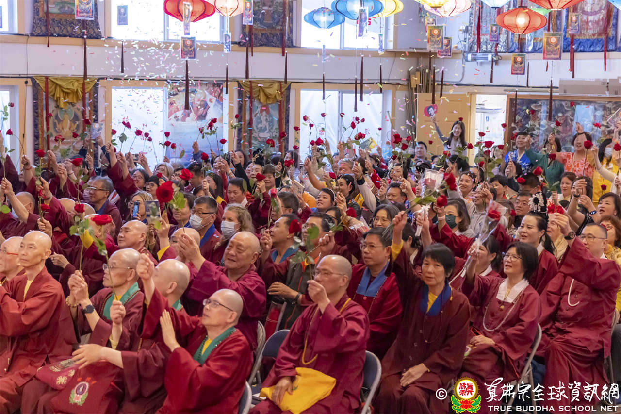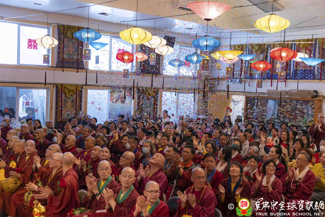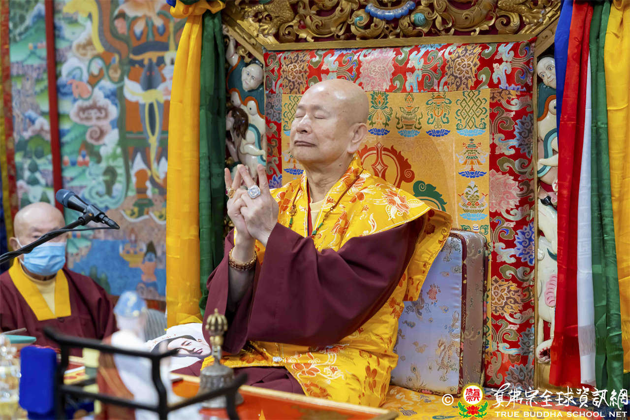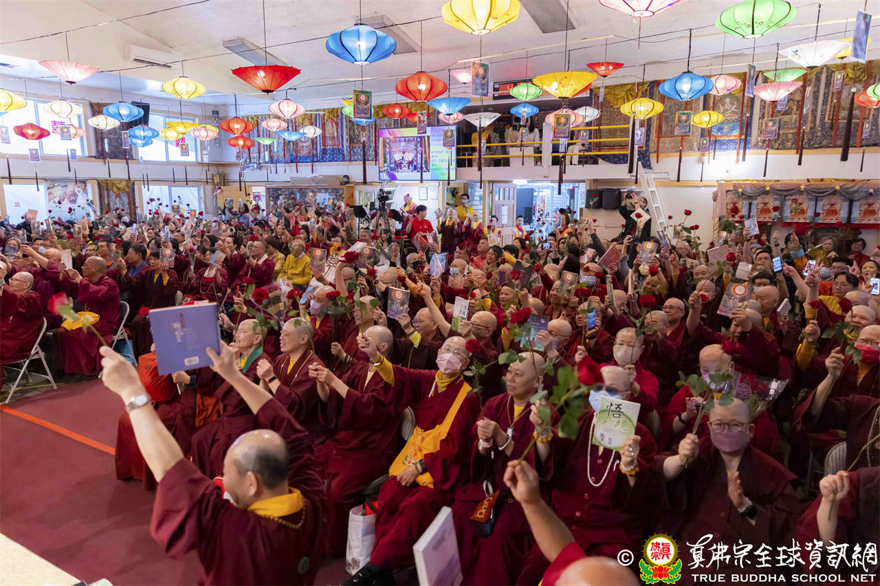 接著請世界真佛宗宗務委員會長蓮花程祖上師、處長們及彩虹雷藏寺住持蓮彥上師、西雅圖雷藏寺代表碧珍上師、台灣雷藏寺住持蓮哲上師出列,頂禮根本上師及壇城三寶,並由會長蓮花程祖上師,代表全球真佛弟子,敬獻賀禮供養真佛宗創辦人無上法王聖尊蓮生活佛。