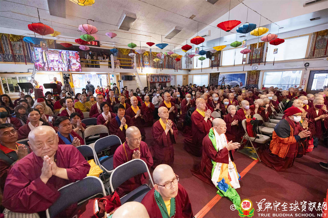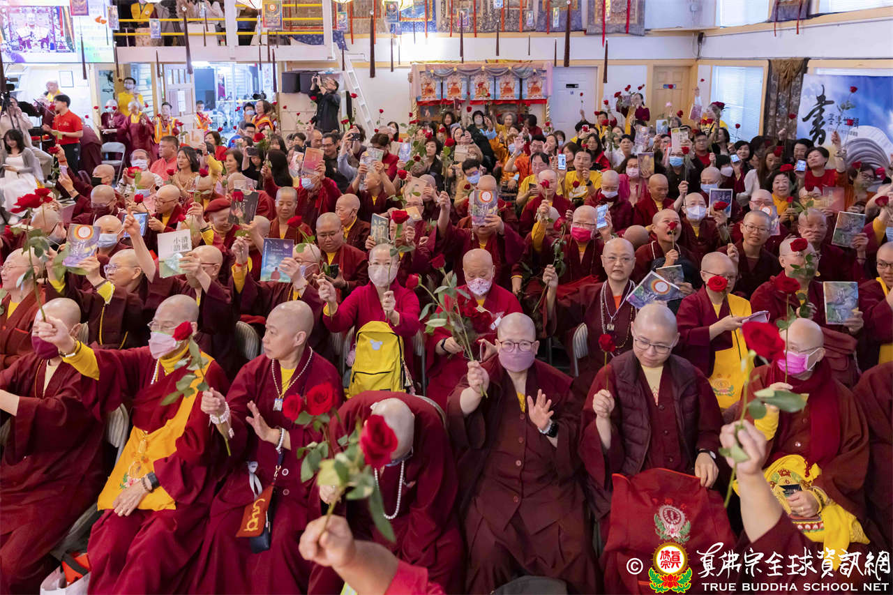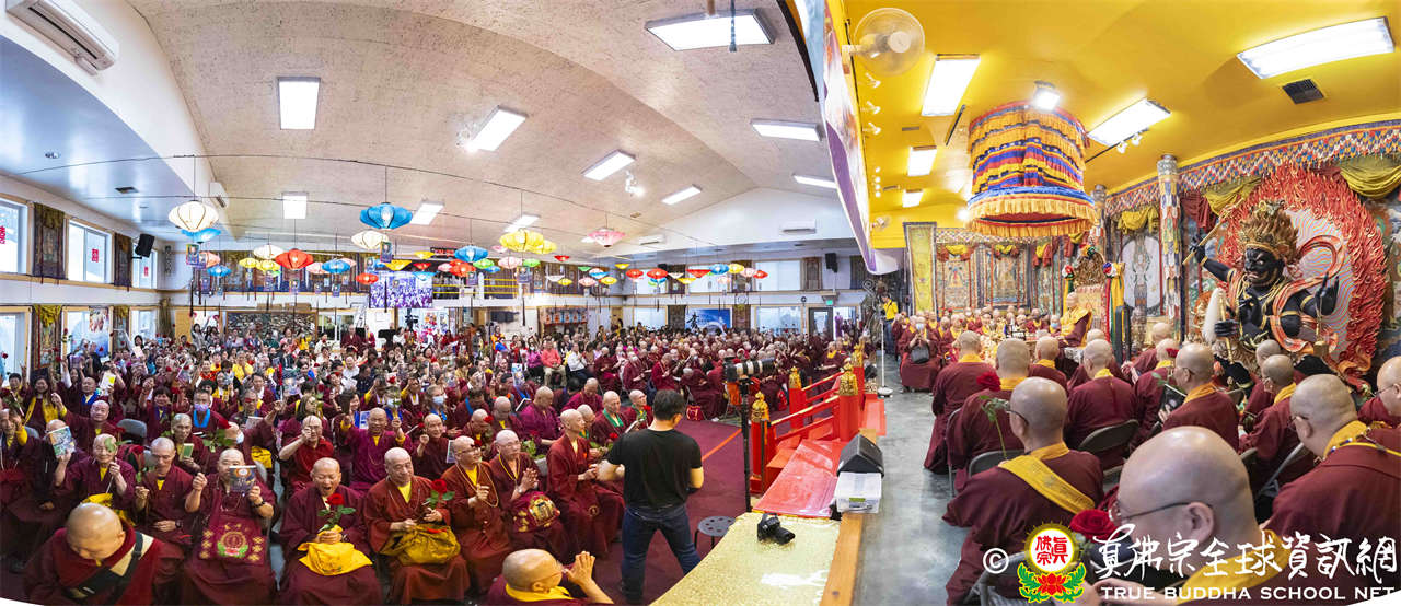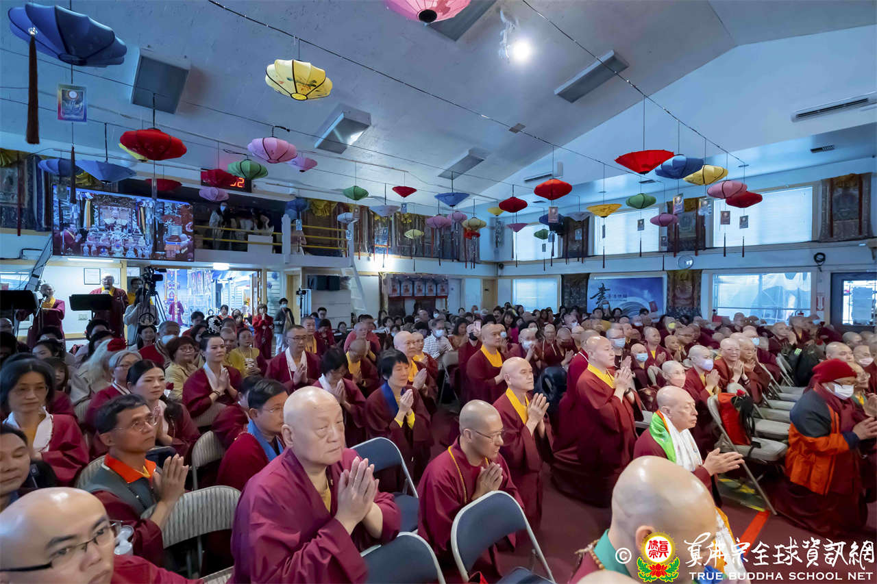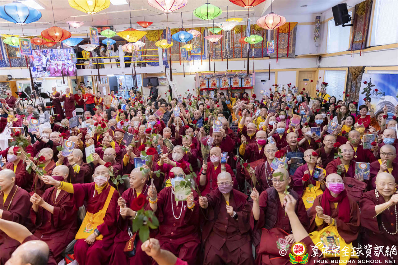 接著請世界真佛宗宗務委員會長蓮花程祖上師、處長們及彩虹雷藏寺住持蓮彥上師、西雅圖雷藏寺代表碧珍上師、台灣雷藏寺住持蓮哲上師出列,頂禮根本上師及壇城三寶,並由會長蓮花程祖上師,代表全球真佛弟子,敬獻賀禮供養真佛宗創辦人無上法王聖尊蓮生活佛。