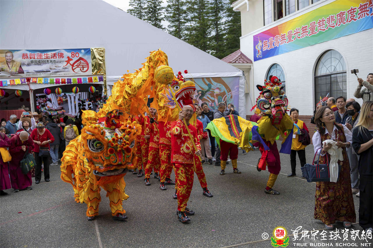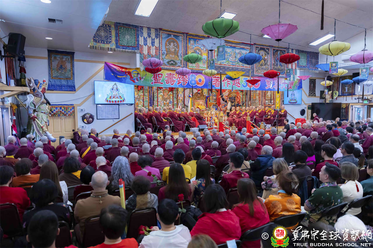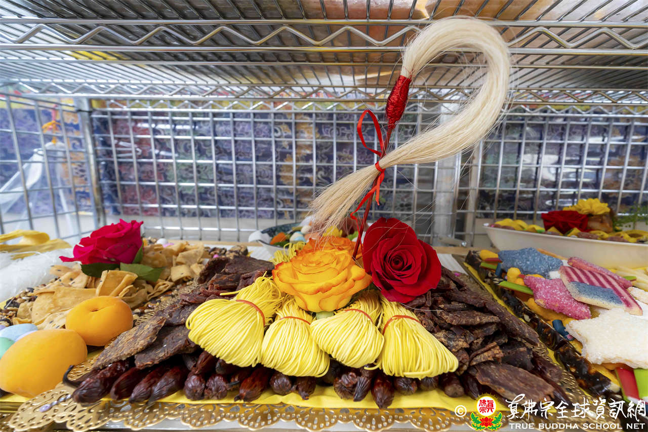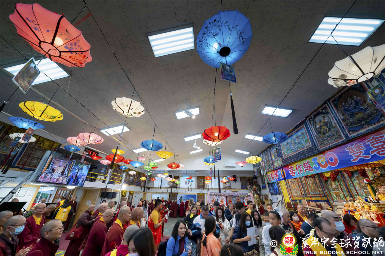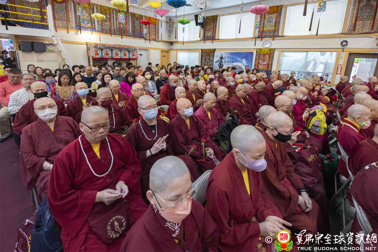 接著請世界真佛宗宗務委員會長蓮花程祖上師、處長們及彩虹雷藏寺住持蓮彥上師、西雅圖雷藏寺代表碧珍上師、台灣雷藏寺住持蓮哲上師出列,頂禮根本上師及壇城三寶,並由會長蓮花程祖上師,代表全球真佛弟子,敬獻賀禮供養真佛宗創辦人無上法王聖尊蓮生活佛。