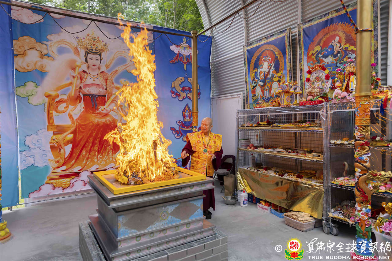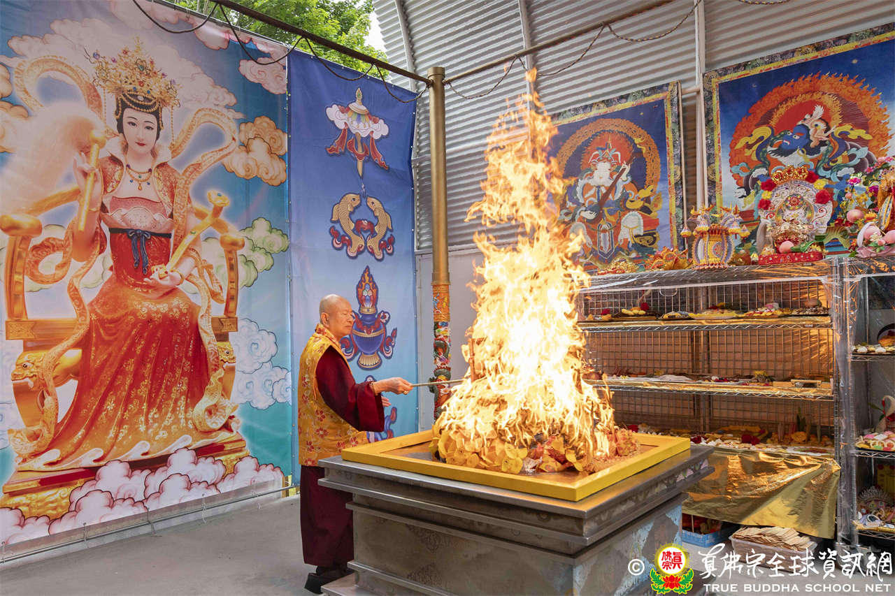 護摩火熊熊升起,師佛演化手印加持,一切如法如儀,法會吉祥圓滿。
