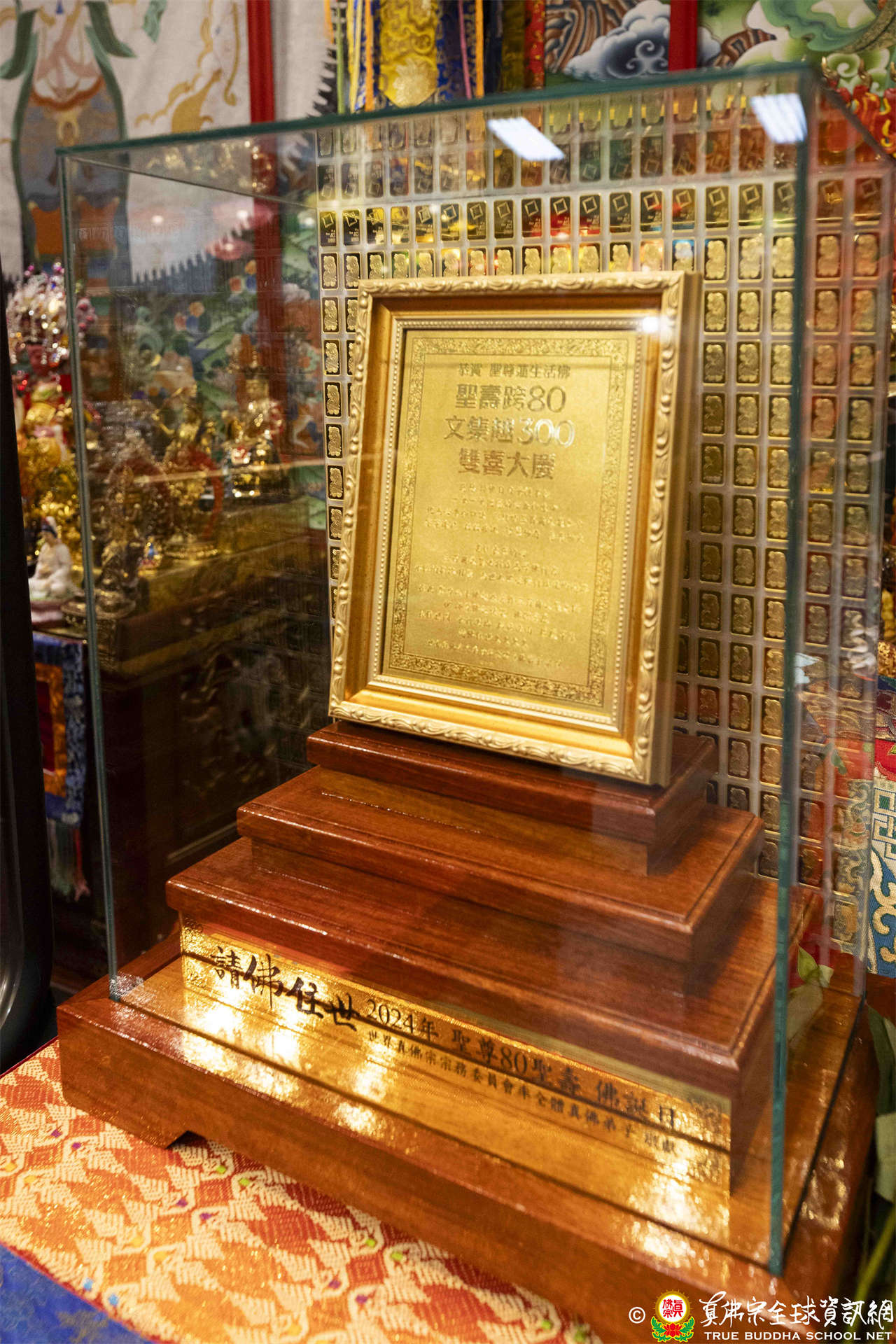 這份禮物由300餘塊純金組成,每一塊黃金背後都有一本書名,代表著師佛的300餘冊文集。