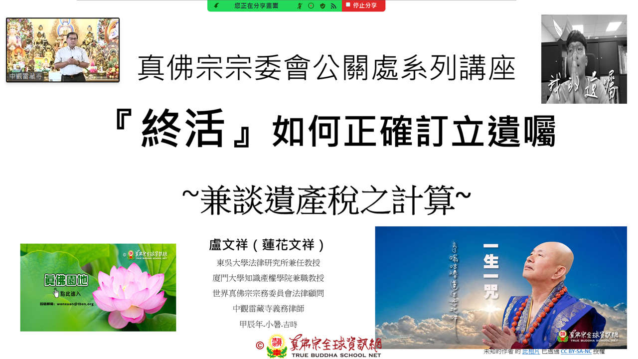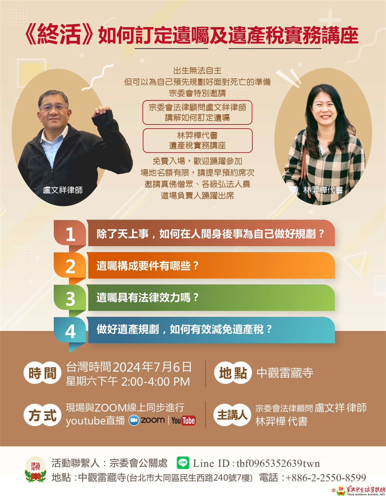 2024年7月6日,公關處特別邀請宗委會法律顧問盧文祥律師,假藉中觀雷藏寺進行一場講座,採現場與ZOOM線上同步進行,youtube直播。盧文祥律師同時也提到與遺囑內容息息相關的遺產項目,邀請林羿樺代書主講遺產稅實務規劃。