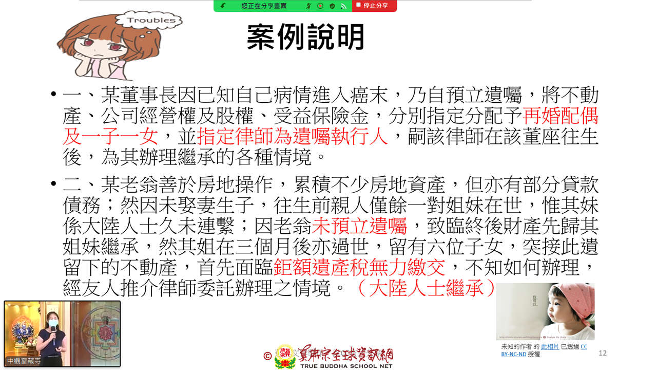 雖然盧律師特別解釋道:各國法令不盡相同,今日講座係以中華民國民法繼承編相關規定為依據,在臺澎金馬管轄地域內生效,若有其他地域之相關繼承事件,請逕自查明為禱。對於其他國家的僧眾同門,僅供參考用。
