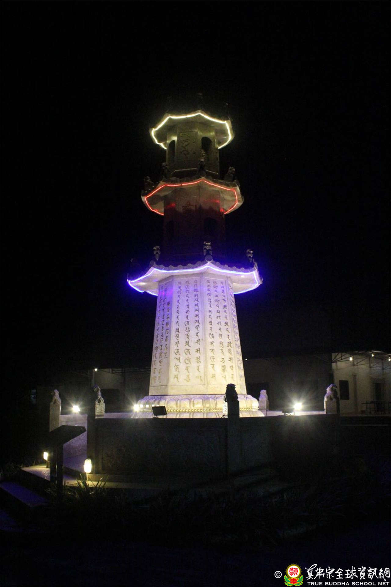 持咒進行到最後一天的晚上,護摩火供完成後才停止。接著蓮飛上師又帶領大眾點燈經行,繞尊勝佛塔後,回到壇城前,結束了五天四夜的尊勝佛母大法會。在賜福灌頂前,所有同門在壇城前大合照留念。