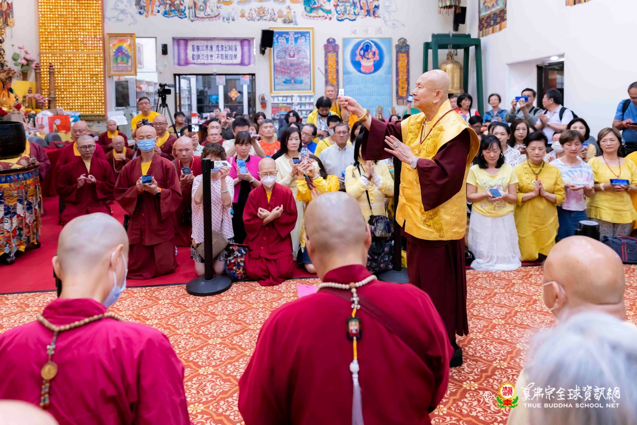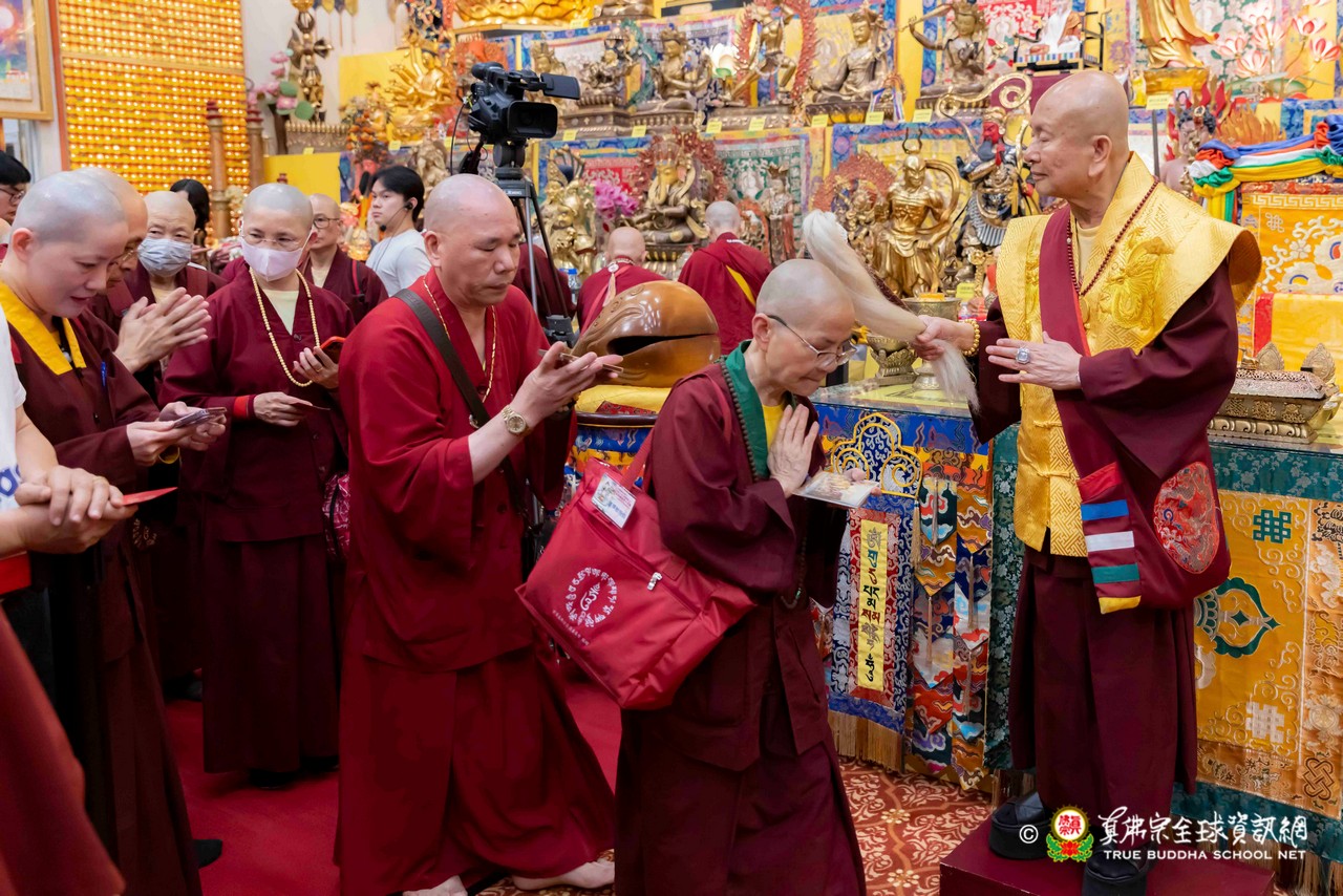 聖尊講解維摩詰經後,為新皈依者做皈依灌頂,加持大悲咒水,並以拂塵一一加持與會大眾。