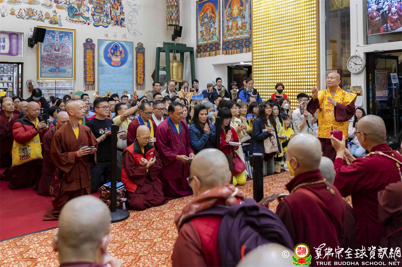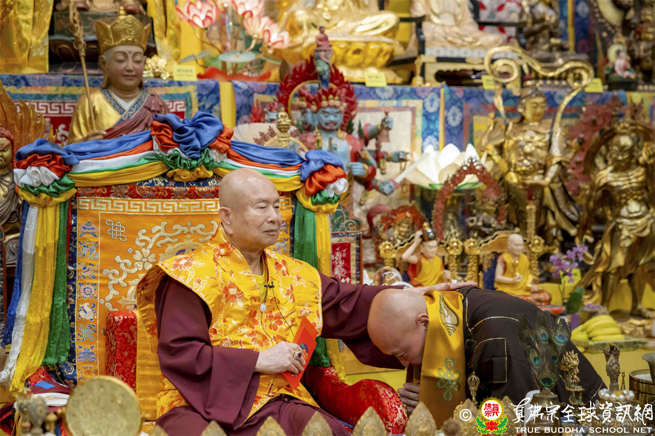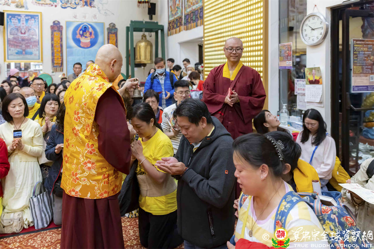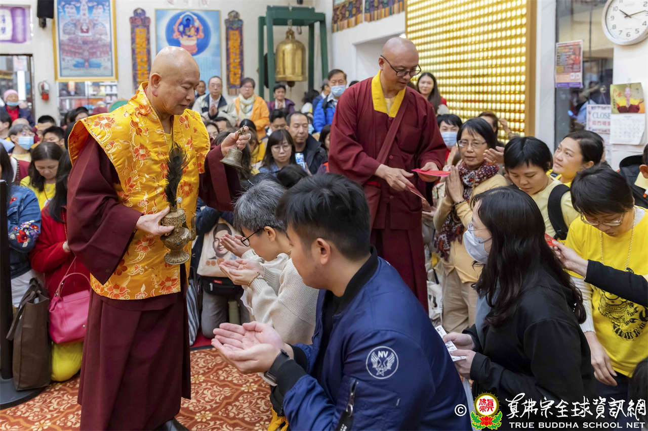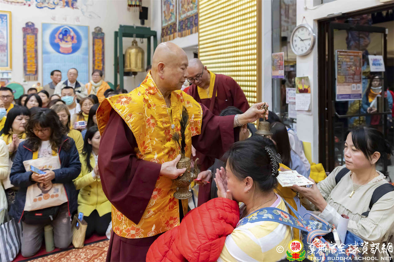 聖尊精彩寶貴的法語開示後,慈悲為新皈依弟子做皈依灌頂、加持大悲咒水、開光佛像,及持拂塵加持與會大眾。