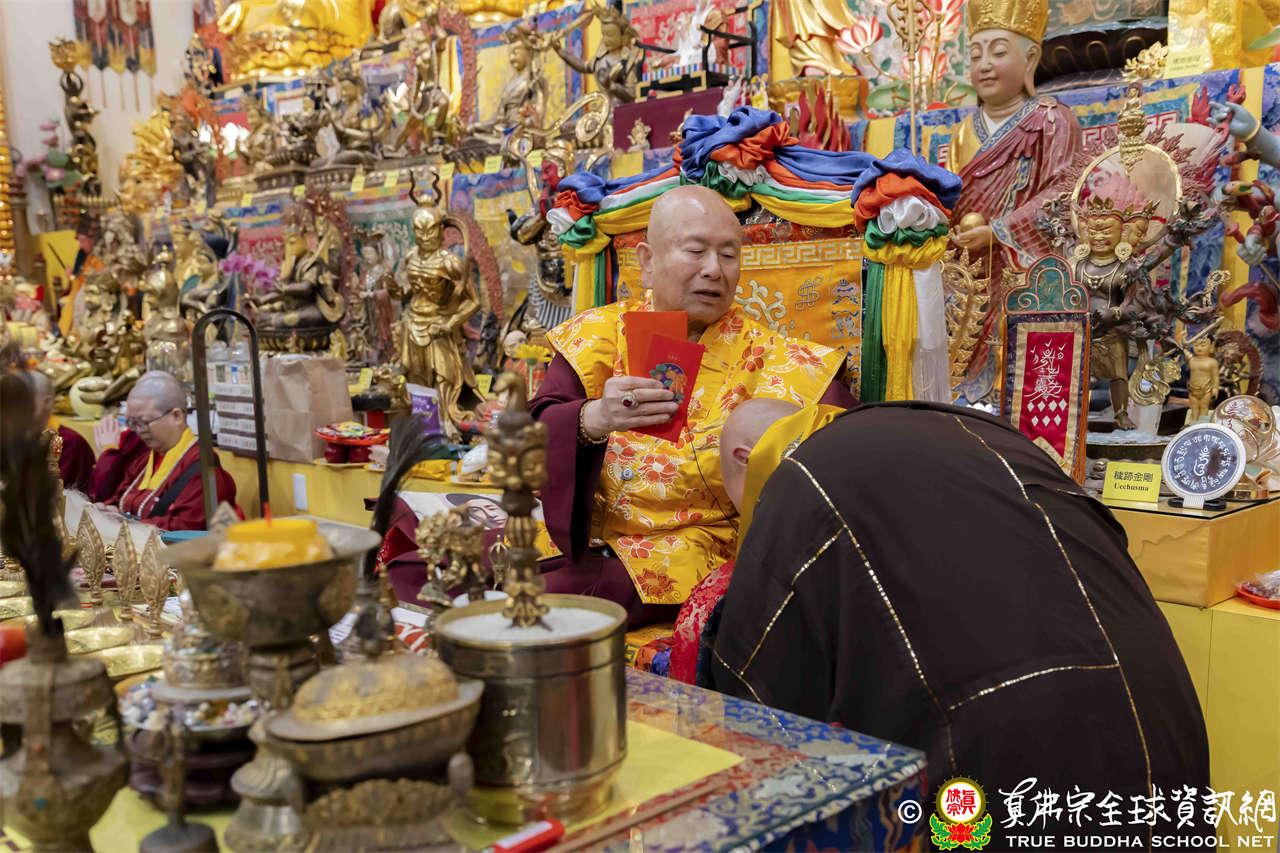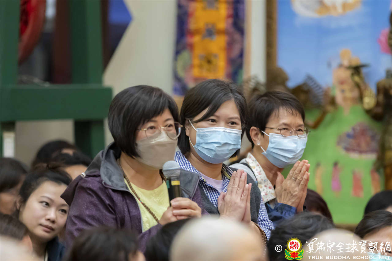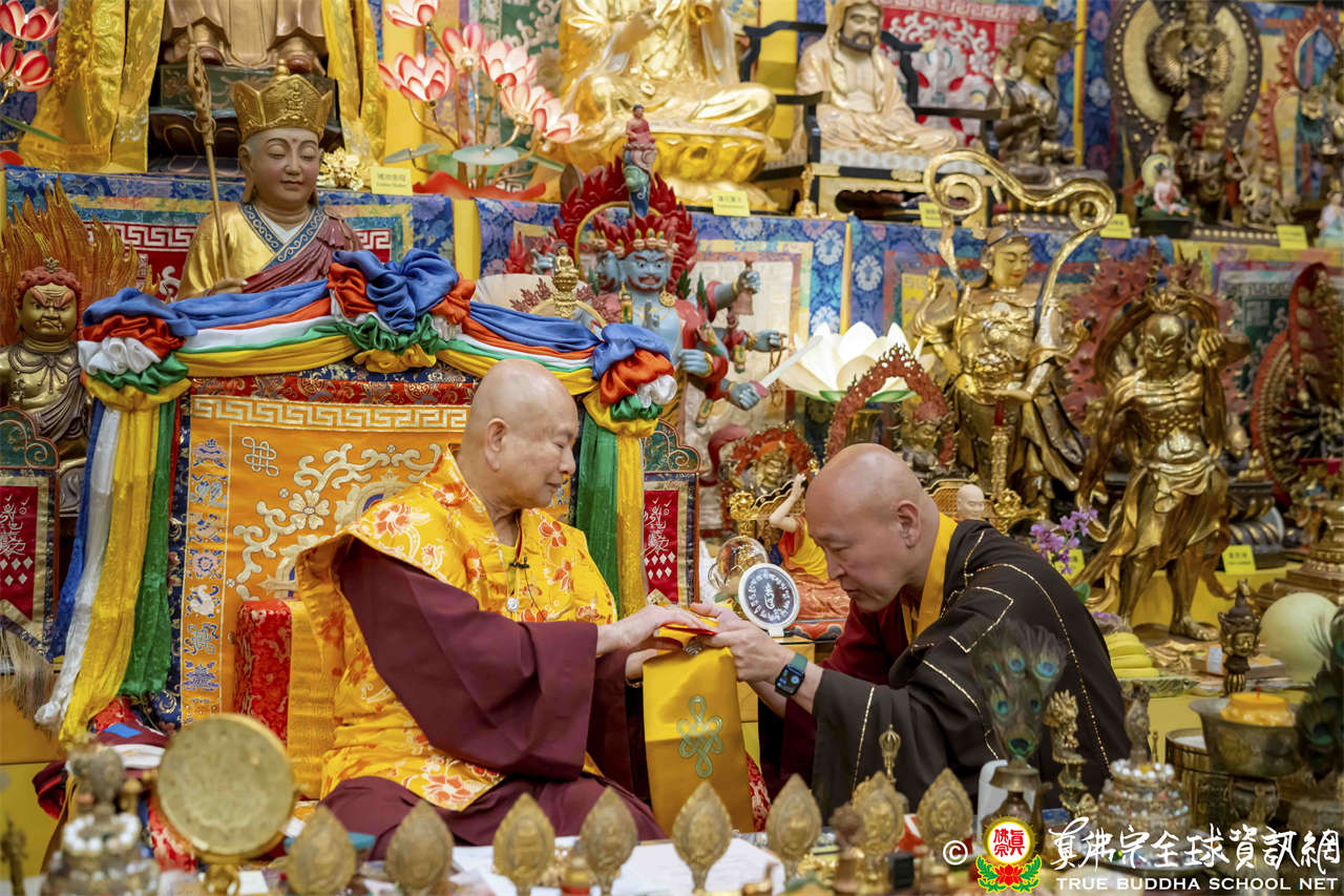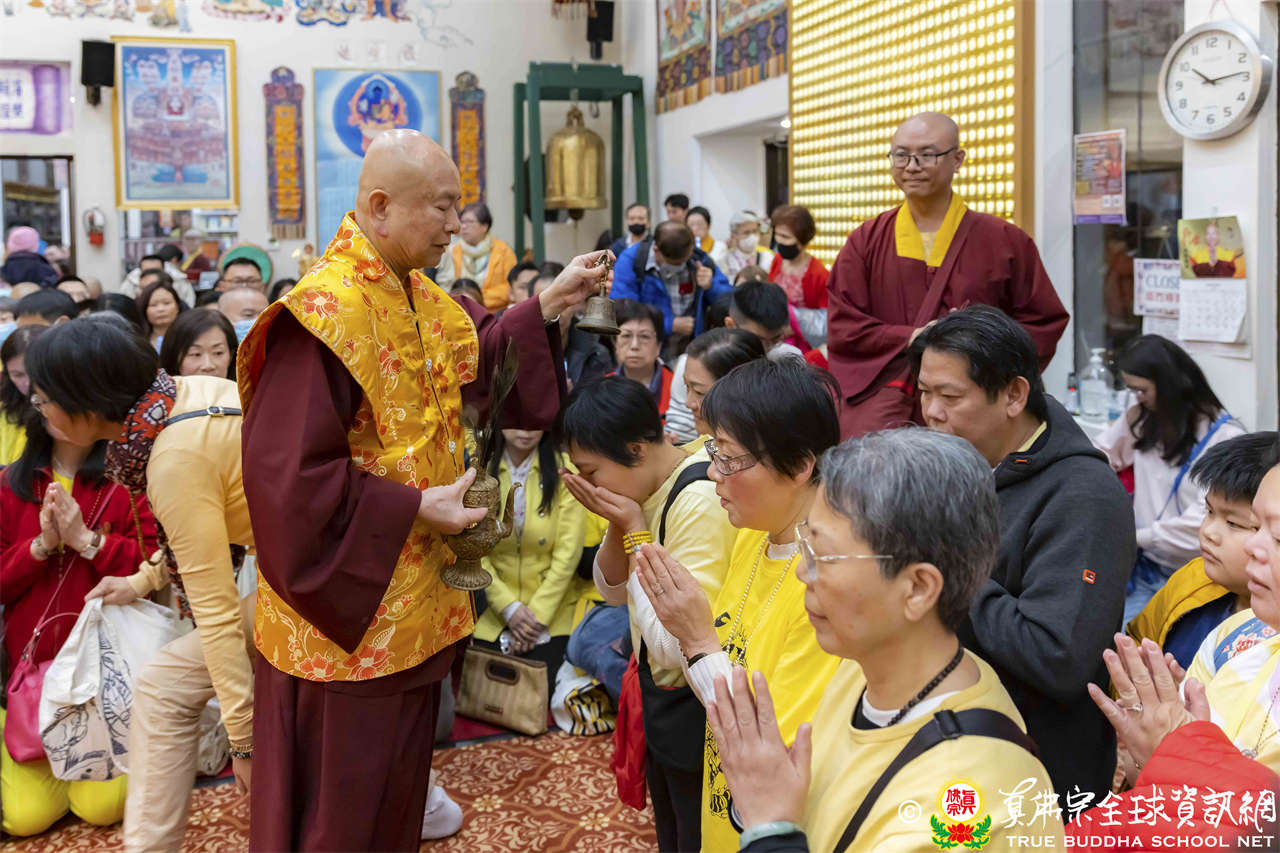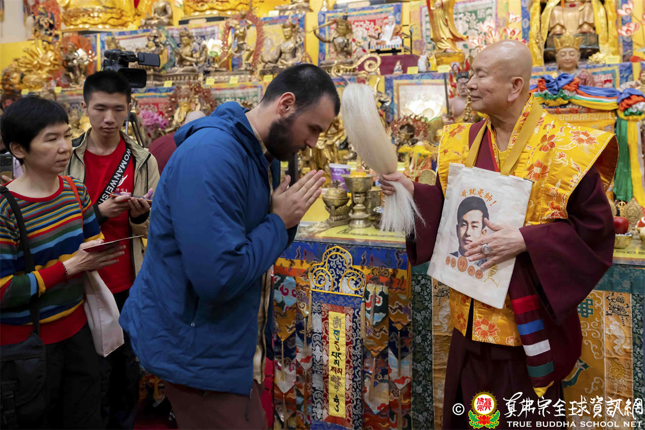 聖尊精彩寶貴的法語開示後,慈悲為新皈依弟子做皈依灌頂、加持大悲咒水、開光佛像,及持拂塵加持與會大眾。