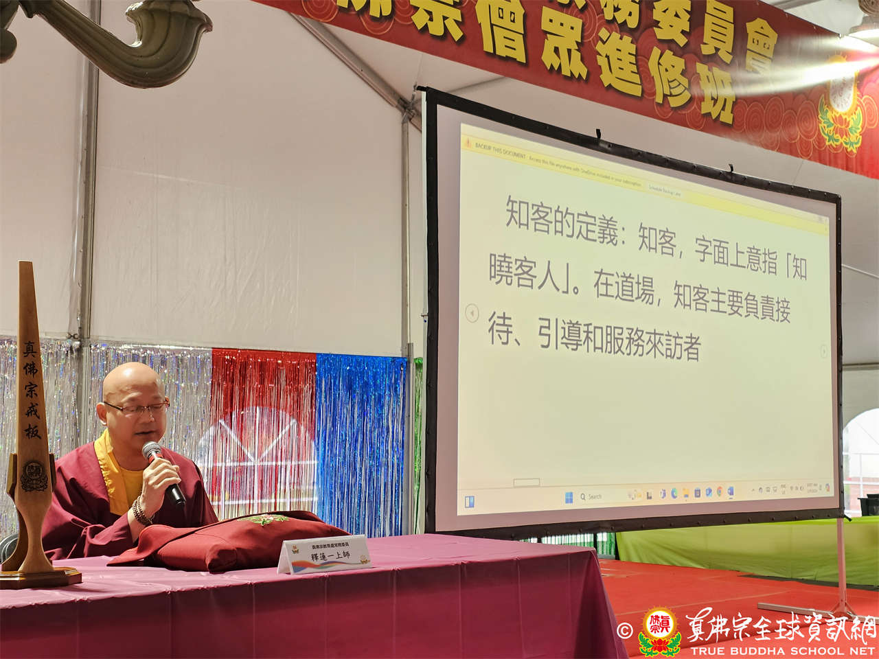 第一堂課登場的是「知客的重要」,由蓮一上師主講。「知客」於字面上的解釋為「知曉客人」,可謂各道場第一線接觸來訪者的人,亦是道場與外界之間的重要聯繫人,角色非常重要。往往來訪者的第一印象也取決於知客的態度,所以推動法務興旺,道場務必要重視知客的培訓計畫。