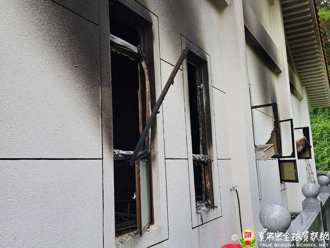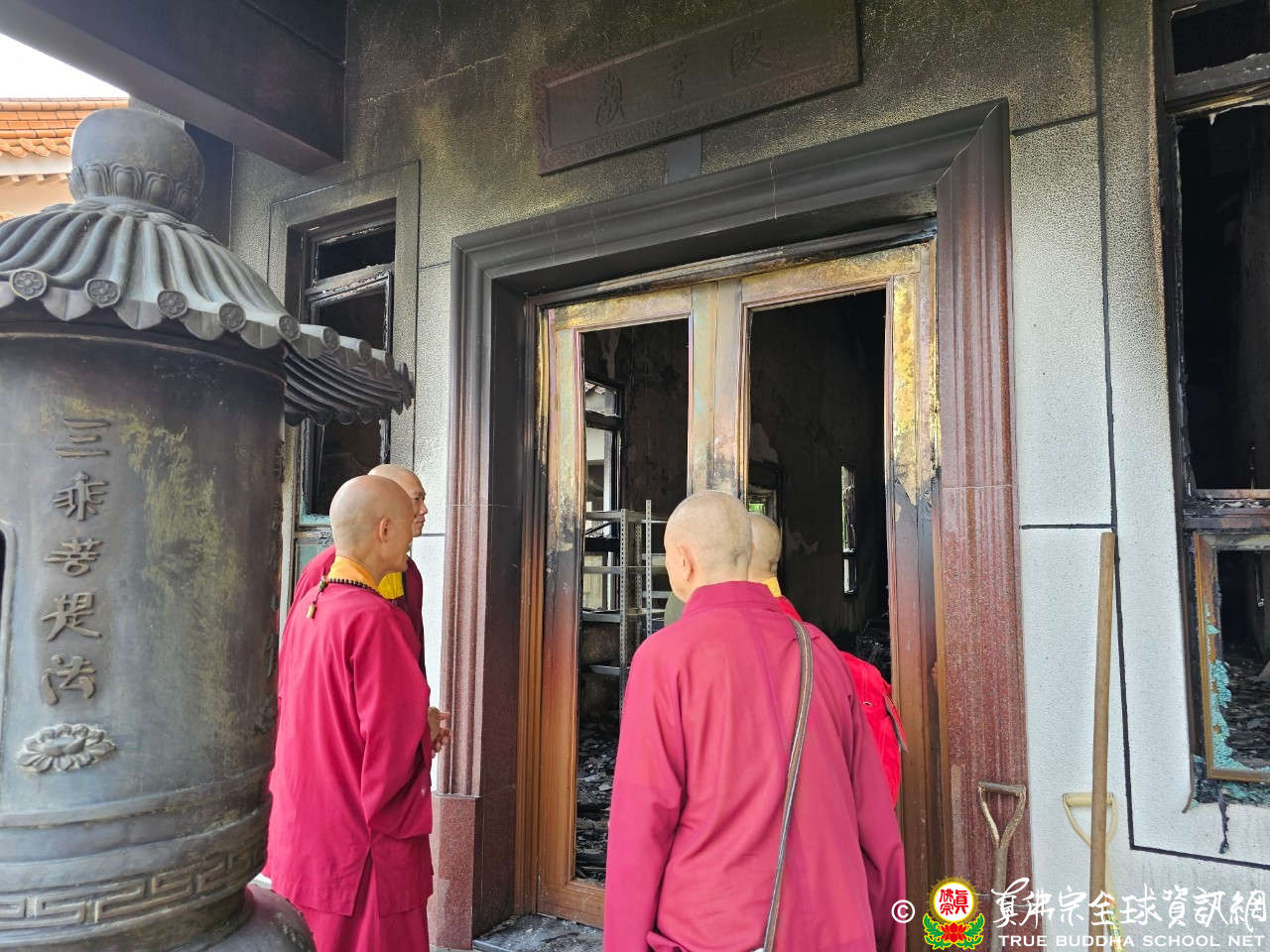 這次的探訪中,親臨火災發生點「觀音殿」,殿內全數燒毀,包含密壇的三十二尊佛像,門窗也因為高溫而變形,地板全是瓦礫碎片,令人觸目驚心。所幸當初天花板使用防火建材,僅是觀音殿內部受災,外牆則是被煙燻黑了,其他各殿無恙,沒有人員傷亡。