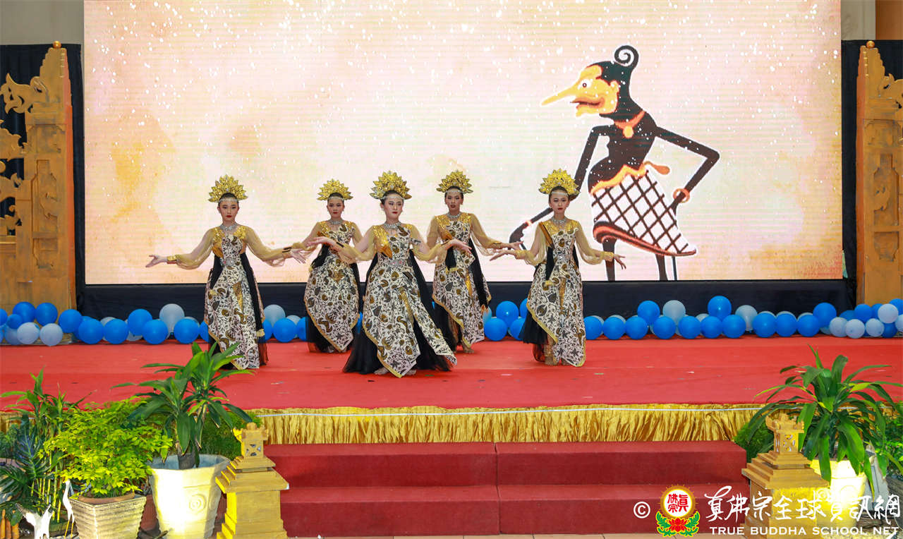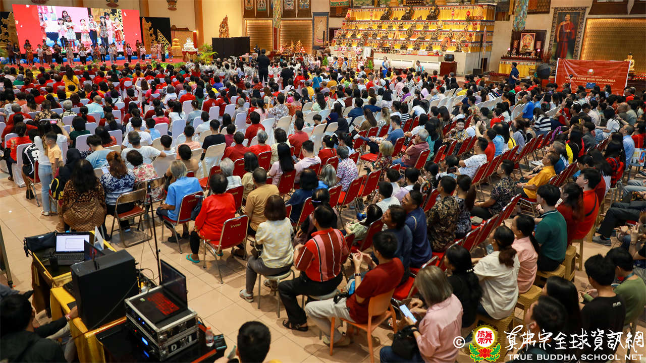 今日蒞臨的上師除了蓮飛上師,還有大覺堂的蓮樣,蓮妗上師,及馬來西亞的蓮一上師。下午三點多,整個大殿已經座無虛席。節目開始,首先大眾起立唱國歌。然後是敬德學校的小學生表演昂格浪樂曲,印尼雷藏寺佛學班學生唱“感恩真佛”宗歌,大屏幕上放出師佛蒞臨為印尼雷藏寺開光安座的照片,以及一些前輩們的照片,令人勾起無限回憶。